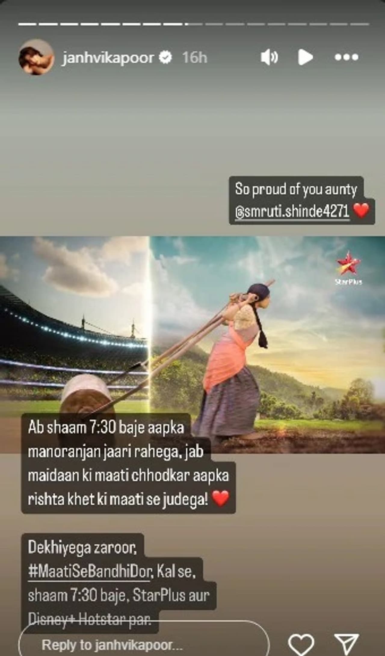 Janhvi also encouraged everyone to watch the show, writing, "Ab shaam 7:30 baje aapka manoranjan jaari rahega, jab maidaan ki maati chhodkar aapka rishta khet ki maati se judega (sic)."