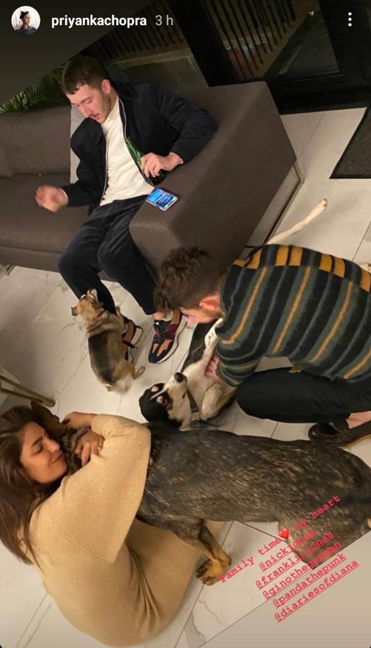Priyanka took to Instagram to posted a few pictures with their husband his younger brother Franklin Jonas. The couple were also seen cuddling their three dogs Gino, Diana and Panda. Nick and Priyanka were twinned in shades of brown. Sharing the photo, Priyanka captioned it, "Family time (heart emoji) my heart," and went on to tag all of them, including the dogs.