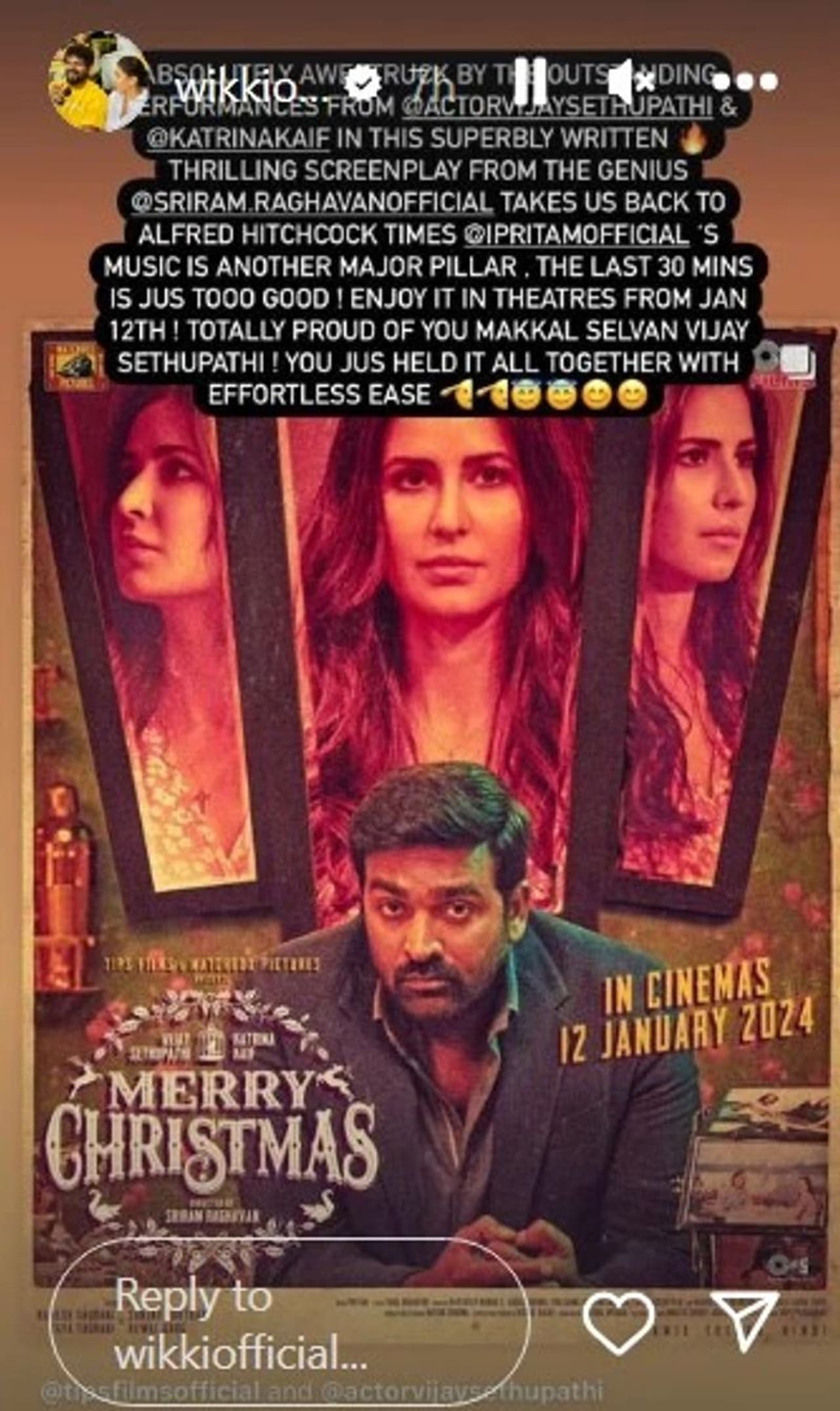 Taking to his Instagram Stories, filmmaker Vignesh Shivan wrote, “Absolutely awestruck by the outstanding performances from @actorvijaysethupathi & @katrinakaif in this superbly written thrilling screenplay from the genius @sriram.raghavanofficial takes us back to Alfred Hitchcock times @ipritamofficial's music is another major pillar, the last 30 mins is just tooo good! Enjoy it in theatres from Jan12th! Totally proud of you Makkal Selvan Vijay Sethupathi! You just held it all together with effortless ease."
