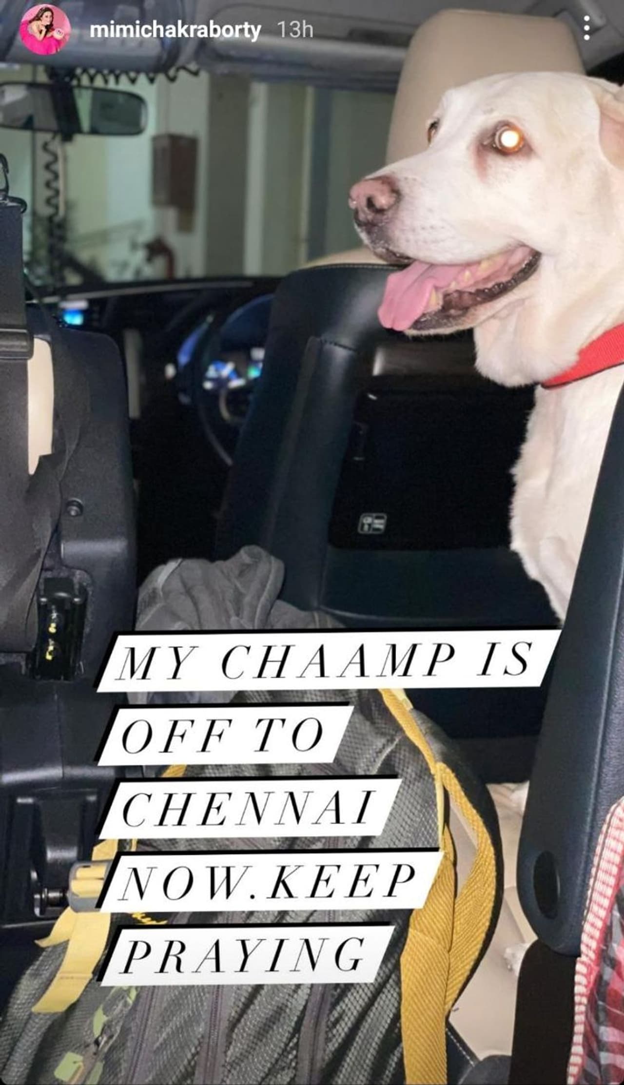 Mimi being a dog mother of two, can't help but show how shattered she is. Yesterday she shared another picture of Chickoo in her Instagram stories, saying, "My Champ is off to Chennai. Now Keep Praying".