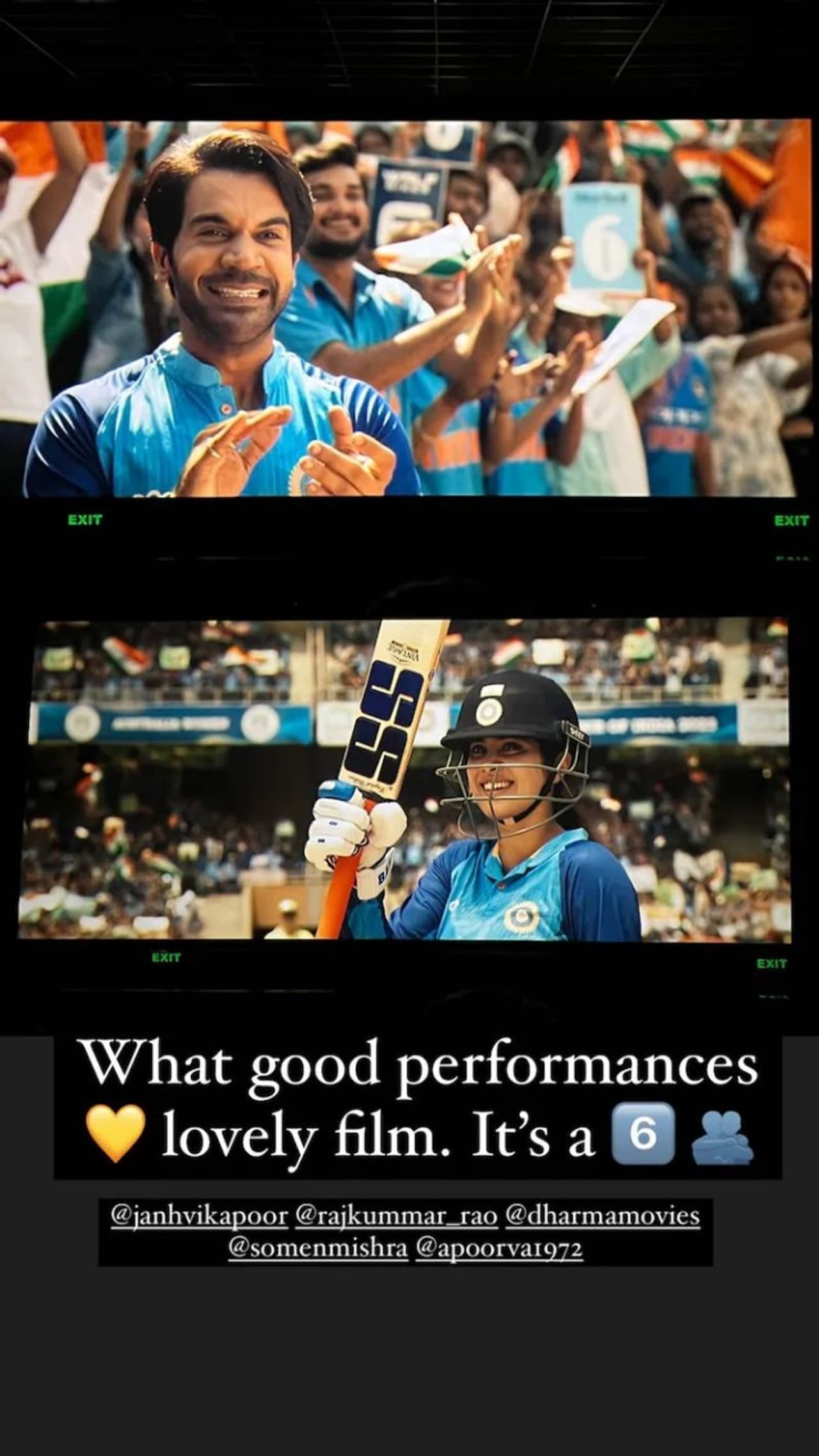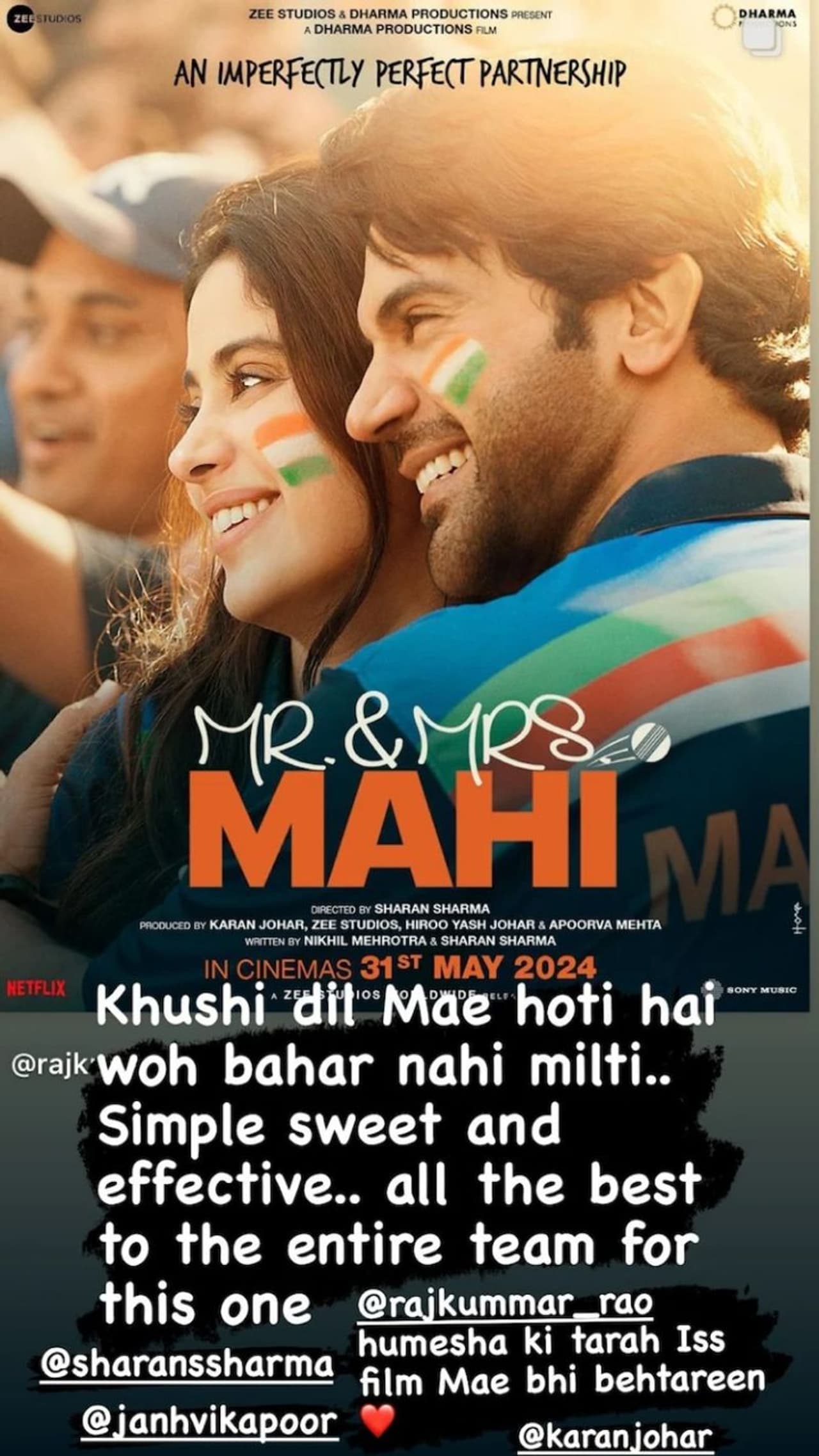 "What a sweet and beautiful film Mr and Mrs Mahi is. The emotion and the love for cricket. And the performances and direction made our hearts smile. Congratulations Janhvi Kapoor, Rajkummar Rao and Karan Johar. Please make time and watch this gem (sic)."