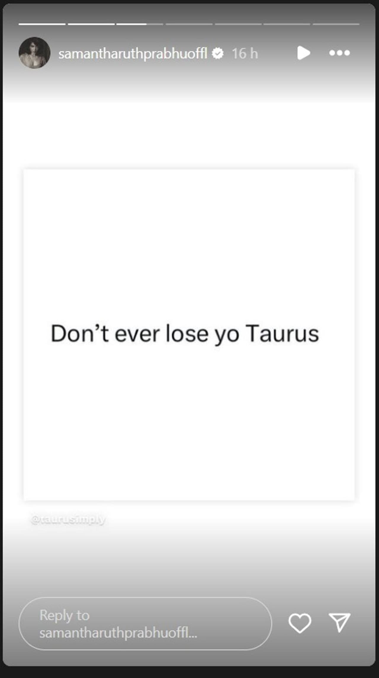 The post shared by Samantha on Wednesday featured a text. It read, "Don't ever lose you Taurus." Samantha's zodiac sign is Taurus. The Family Man actress' message exemplifies her resilience and 'never-give-up' mentality.