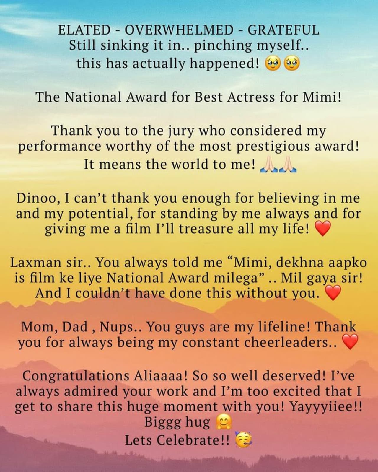Taking to her social media, Kriti expressed her gratitude for the BIG WIN as she wrote, "ELATED - OVERWHELMED - GRATEFUL Still sinking it in.. pinching myself.. this has actually happened! 🥹🥹 The National Award for Best Actress for Mimi! Thank you to the jury who considered my performance worthy of the most prestigious award! It means the world to me! 🙏🏻🙏🏻Dinoo, I can't thank you enough for believing in me and my potential, for standing by me always and for giving me a film I'll treasure all my life! ❤️Laxman sir.. You always told me "Mimi, dekhna aapko is film ke liye National Award milega" ..Mil gaya sir! And I couldn't have done this without you. ❤️ Mom, Dad, Nups.. You guys are my lifeline! Thank you for always being my constant cheerleaders.. ❤️ Congratulations Aliaaaa! So so well deserved! I've always admired your work and I'm too excited that I get to share this huge moment with you! Yayyyiiee!! Biggg hug 🤗Lets Celebrate!! 🥳" She captioned it, "🥹🙏🏻 Eyes are moist, Heart is full! ❤️ The National Award : Best Actress for Mimi 🙏🏻🙏🏻 #Blessed #Grateful 🦋 "