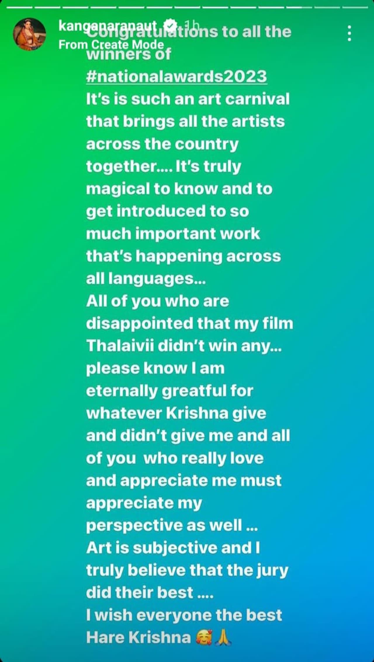Kangana Ranaut, no stranger to expressing her thoughts candidly, took to her Instagram stories to share her sentiments. She congratulated all the winners of the National Film Awards 2023, noting the event as a convergence of artistic excellence from diverse corners of the country. Kangana's message of unity and appreciation for the rich mosaic of Indian cinema reflected the profound impact of such awards in fostering camaraderie among artists.
