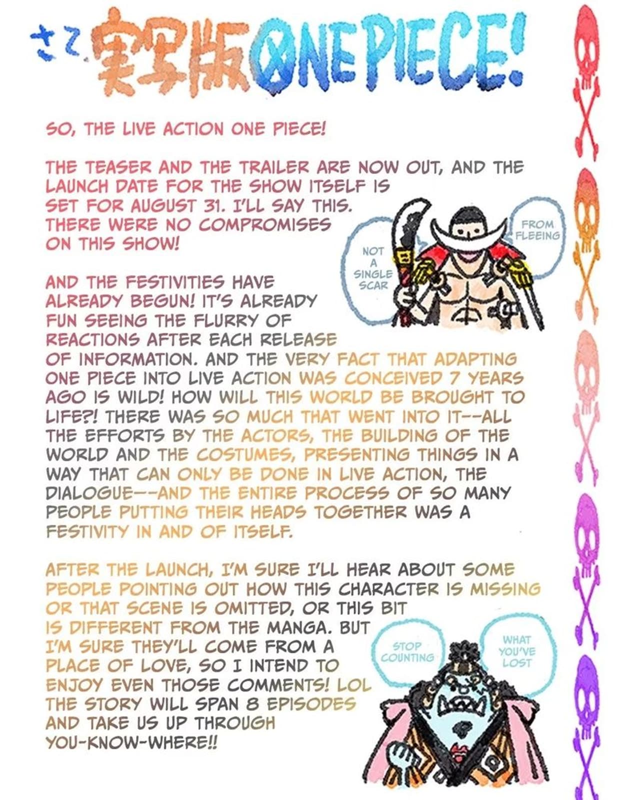 The live-action One Piece series' new trailer, released by Netflix on Saturday, features numerous memorable photos from the anime's East Blue Saga, the first story arc. Along with the Straw Hat Pirates, the 3 minutes and 7 seconds long clip also introduces Buggy the Clown and Arlong. It also recreates scenes from the anime, such as when Zoro fights Captain Mihawk and Luffy gives Nami his cap. Additionally, a letter of thanks from Oda himself was published, along with a number of One Piece photos.