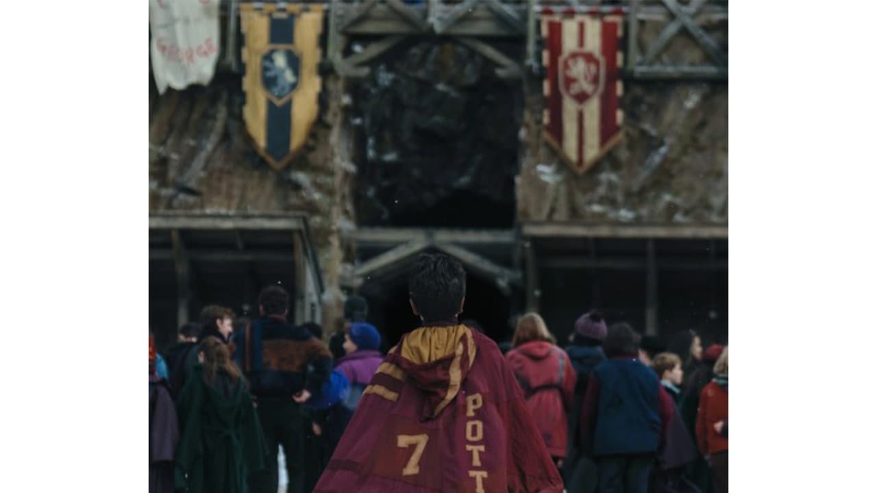 The cloak, with Harry's name and player number displayed on the back, symbolizes his house pride and marks a pivotal moment in the magical world, according to Variety. The photo showcases a bustling scene at the pitch, with students entering and flags of Gryffindor and Hufflepuff flying high.