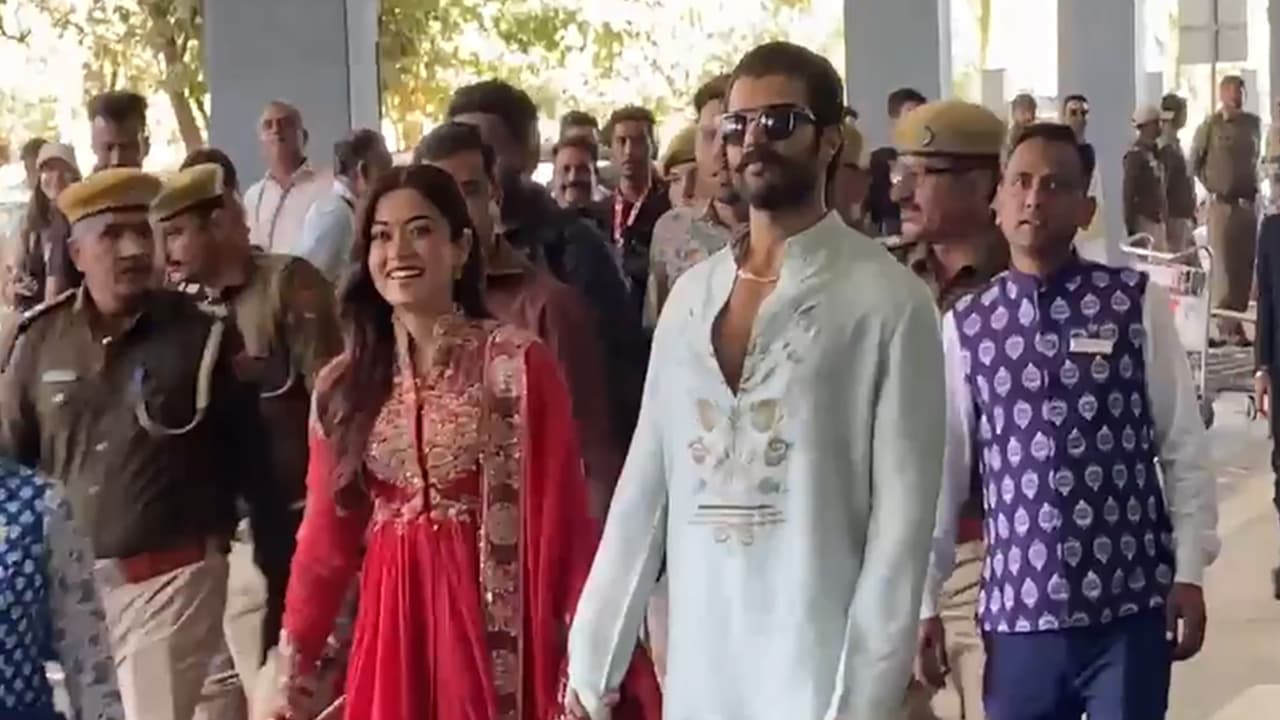 Newlyweds Vijay Deverakonda and Rashmika Mandanna arrived at the Udaipur Airport on Friday for a meet and greet session with their fans. The star couple, who tied the knot on Thursday in the presence of family and close friends in Udaipur, made their first public appearance at the airport. Rashmika was seen wearing a red dress while Deverakonda donned a kurta pyjama that he teamed with sunglasses. The couple were seen sending flying kisses to fans.
