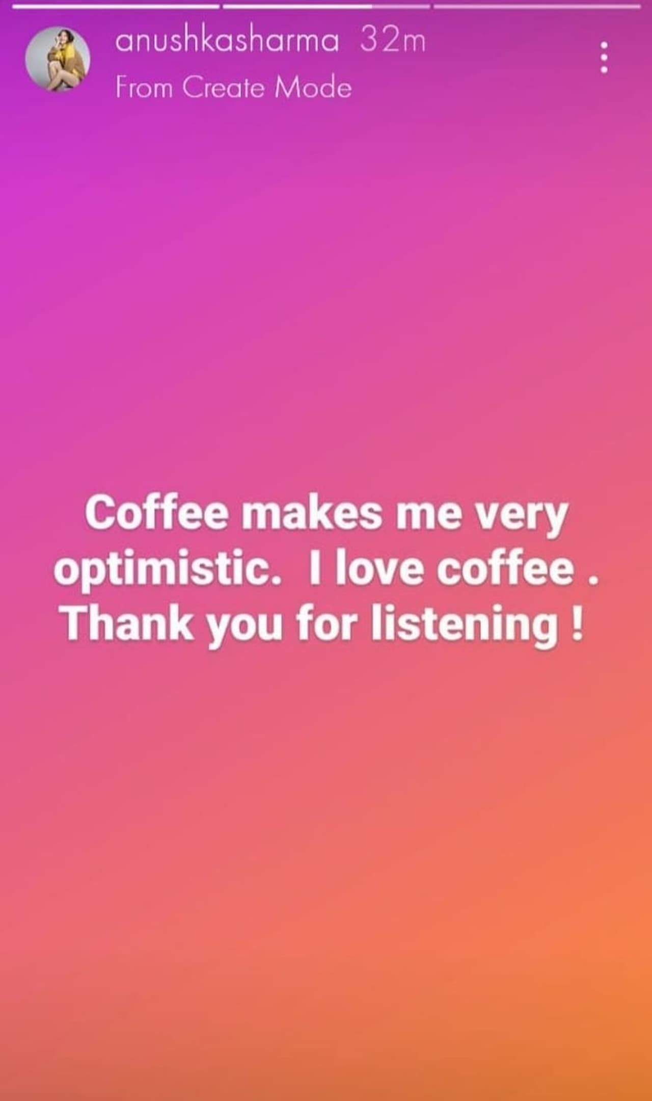 It is not Virat Kohli but her undying love for Coffee. She wrote, "Coffee makes me very optimistic. I love Coffee. Thank you for listening!". Anushka is currently having the time of her life accompanying her husband with daughter Vamika to tournaments. The couple welcomed their daughter in January this year.
