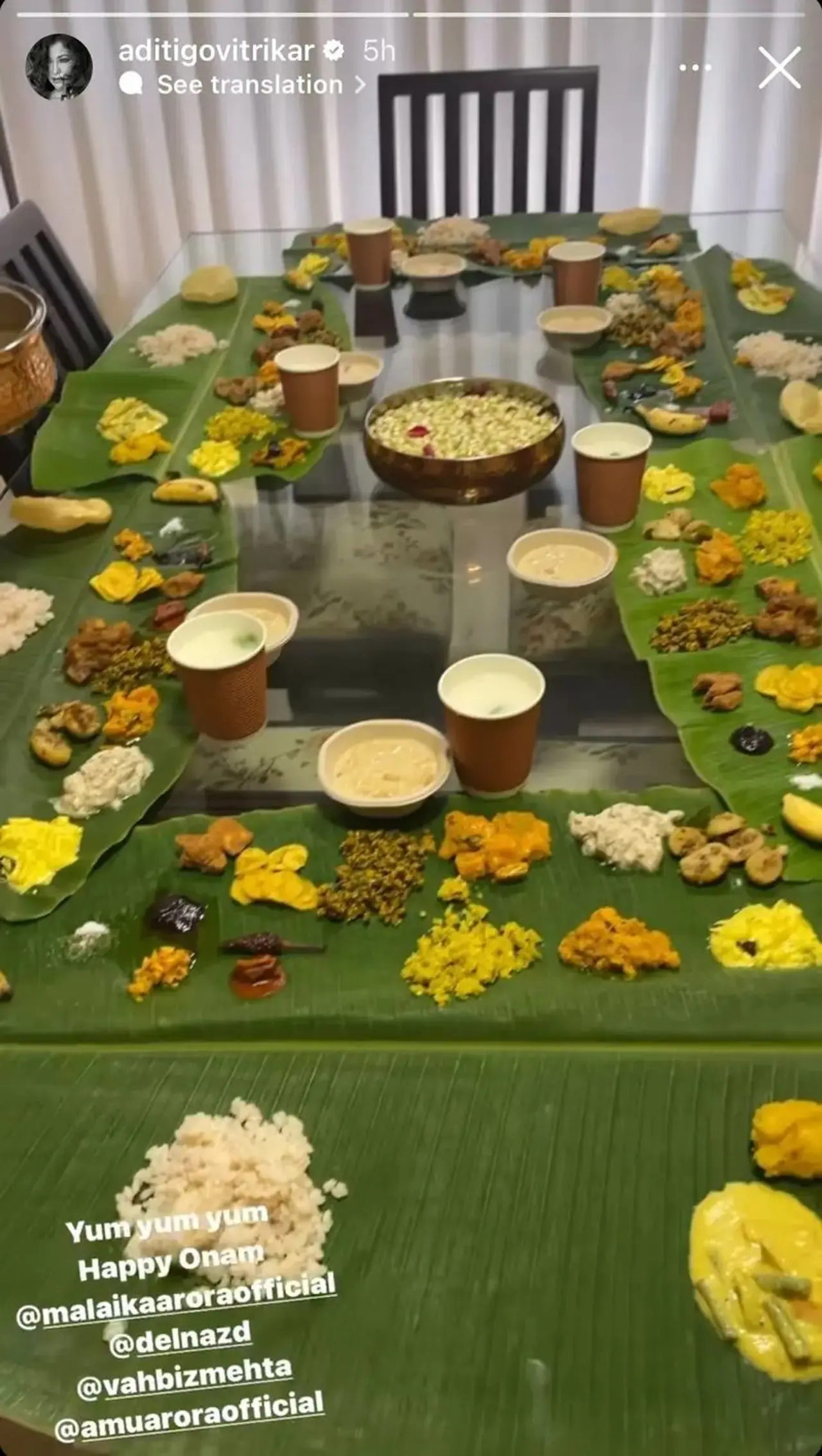 Onam festivities have already commenced at Malaika Arora and Amrita Arora's maternal residence. Their mother, Joyce Arora, is known to prepare the tastiest Onam Sadya, which most celebrities love to relish. As the soiree and celebrations embarked, the Aroras hosted Aditi Govitrikar home for a hearty meal. Malaika's friends Vahbiz Mehta and Delnaz Daruwala were also a part of the Onam festivities this year.