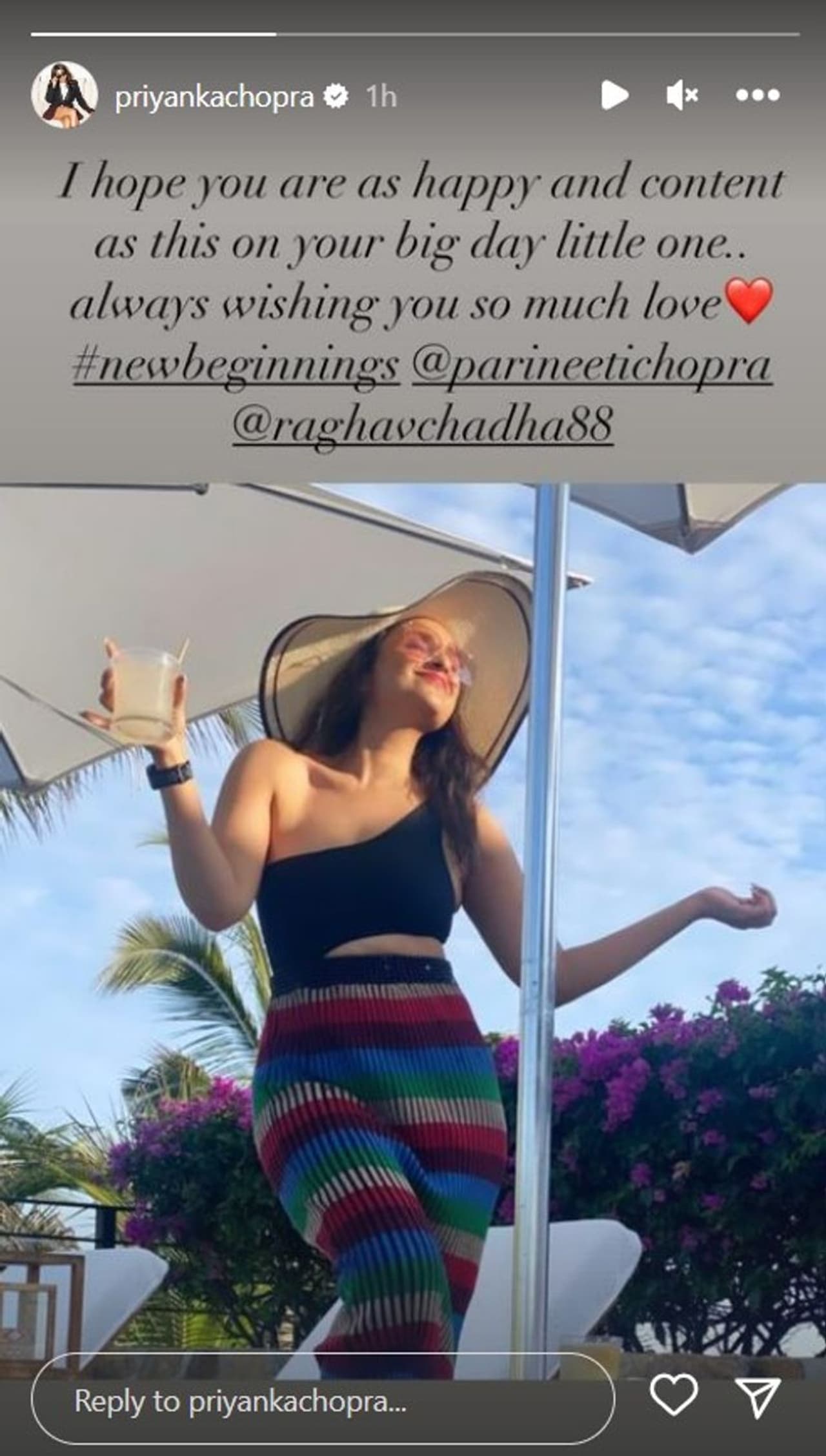 Priyanka Chopra came to Instagram on Saturday morning to share a photo of Parineeti relaxing by the pool before her big day. “I hope you are as happy and content as this on your big day little one. Always wishing you so much love. #newbeginnings.” The actor's message implied that she will miss Parineeti's wedding because she is on tour with hubby Nick Jonas.