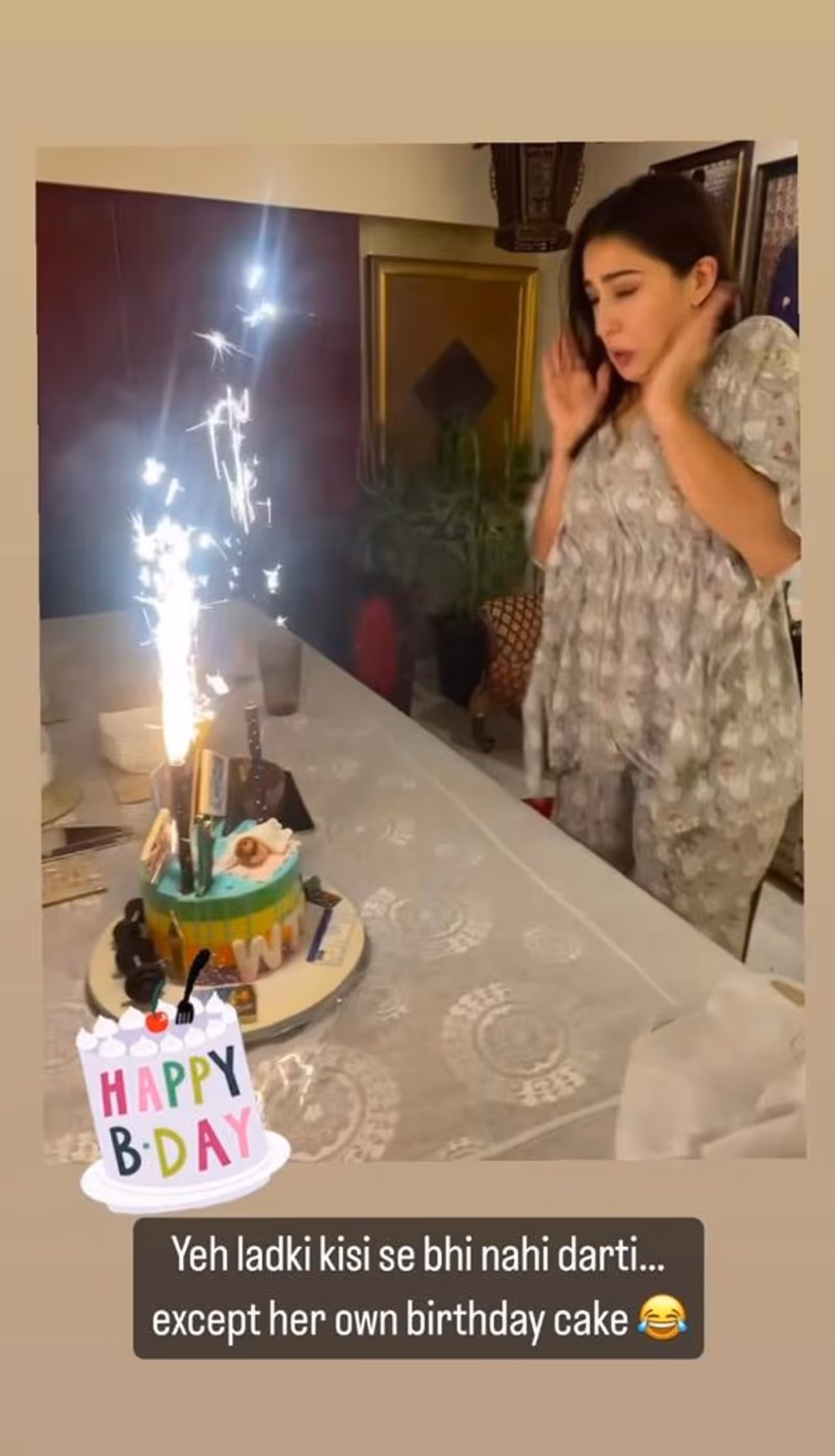 Bollywood actress Sara Ali Khan celebrates her birthday at home with family. She had sparklers on her birthday cake as she turned 28 this Saturday.