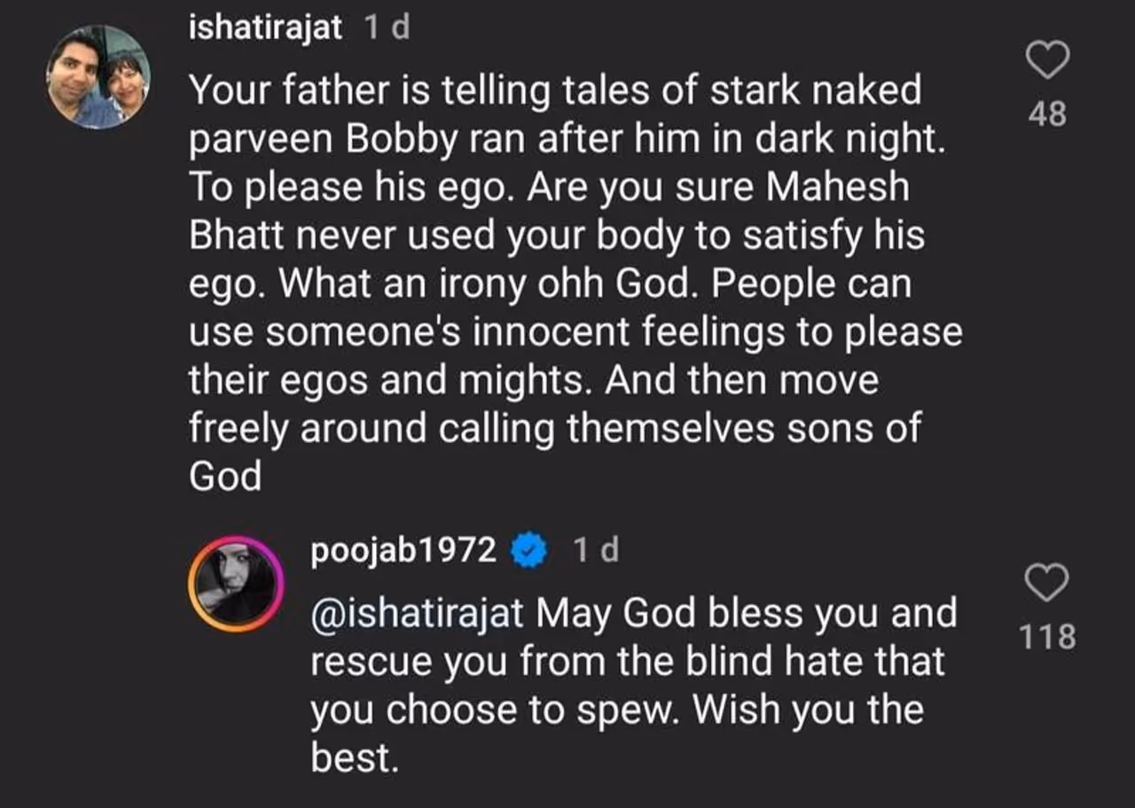 HOW DID FANS REACT: One of them wrote, "Your father is telling tales of stark naked Parveen Babi ran after him in dark night. To please his ego. Are you sure Mahesh Bhatt never used your body to satisfy his ego? What an irony ohh God. People can use someone's innocent feelings to please their egos and might. And then move freely around calling themselves sons of God (sic)." Pooja replied, "May God bless you and rescue you from the blind hate that you choose to spew. Wish you the best (sic)."