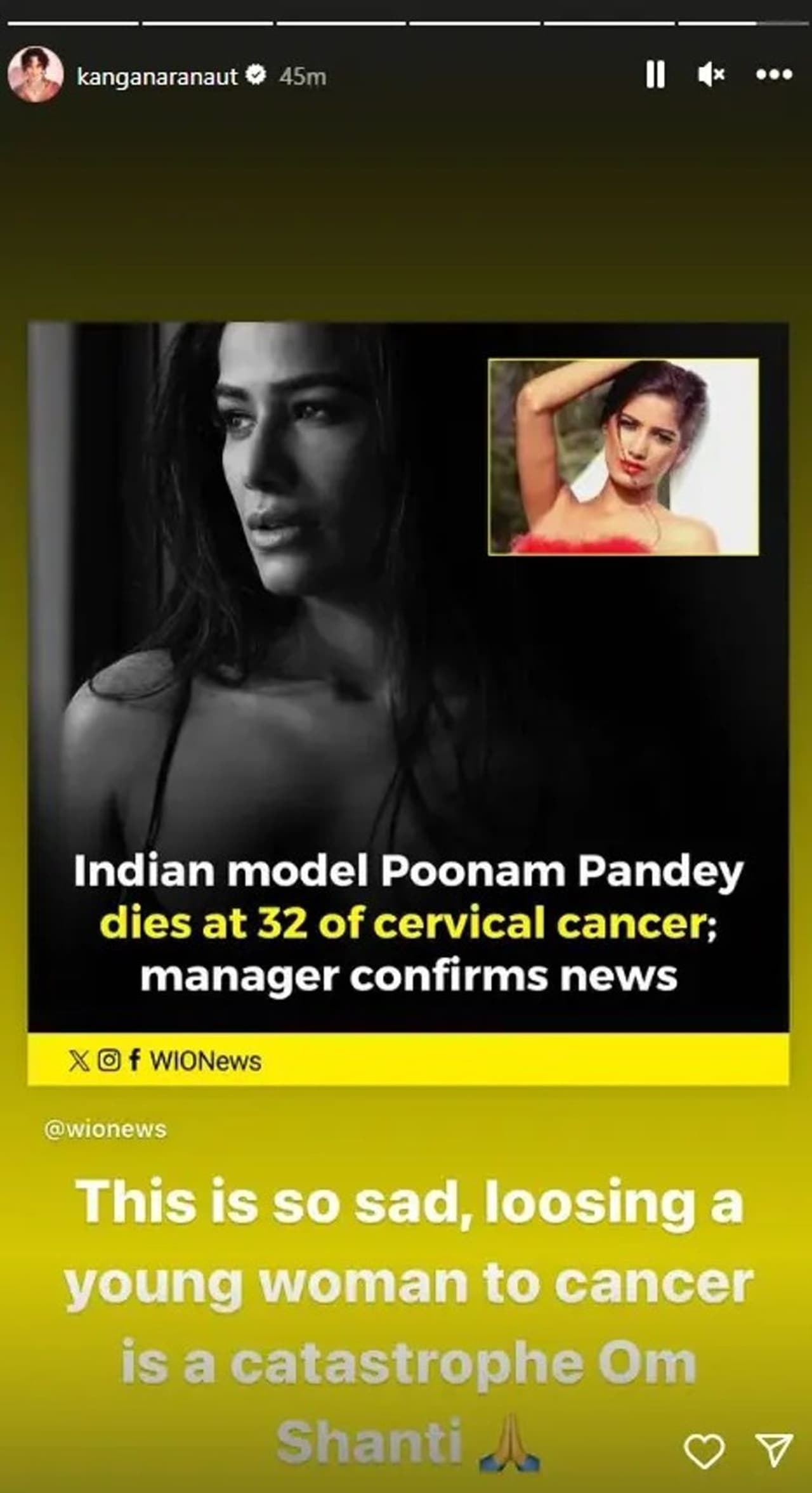 Kangana Ranaut, who hosted Lock Upp Season 1 in which Poonam Pandey was a contestant, reacted to it. The actress took to her Instagram stories and mentioned that the loss saddens her. “This is so sad, losing a young woman to cancer is a catastrophe. Om Shanti,” she wrote.