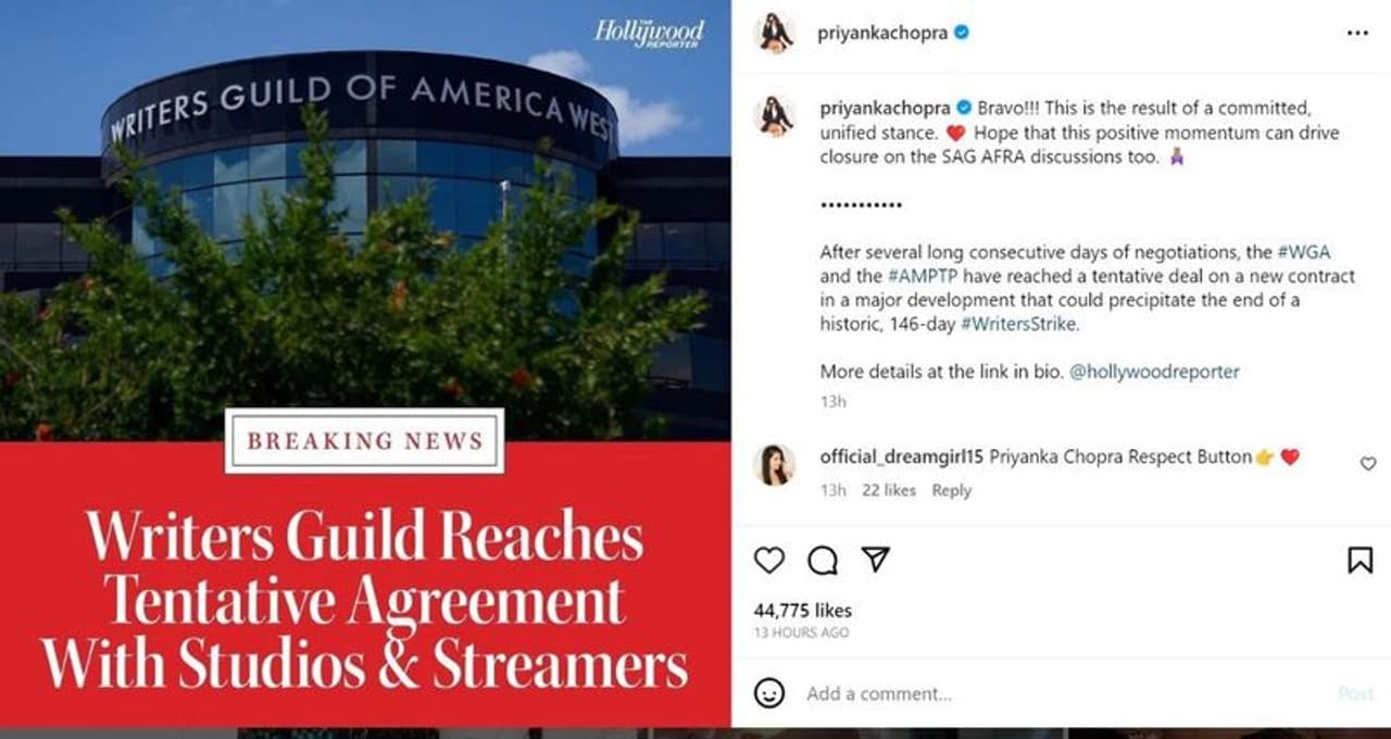 Following the announcement, various celebrities, including Priyanka Chopra, praised and honoured people who made a significant contribution to the success of this deal. On Monday, September 25, the 'Citadel' actress posted a picture to Instagram to express her happiness. She congratulated herself and wrote, "Bravo!!! This is the outcome of a steadfast, coordinated position. We hope that this forward momentum will help bring the SAG AFRA deliberations to a close as well. The #WGA and the #AMPTP have tentatively agreed to a new contract after several protracted days of talks, marking a significant development that might hasten the end of the record, 146-day #WritersStrike (sic).