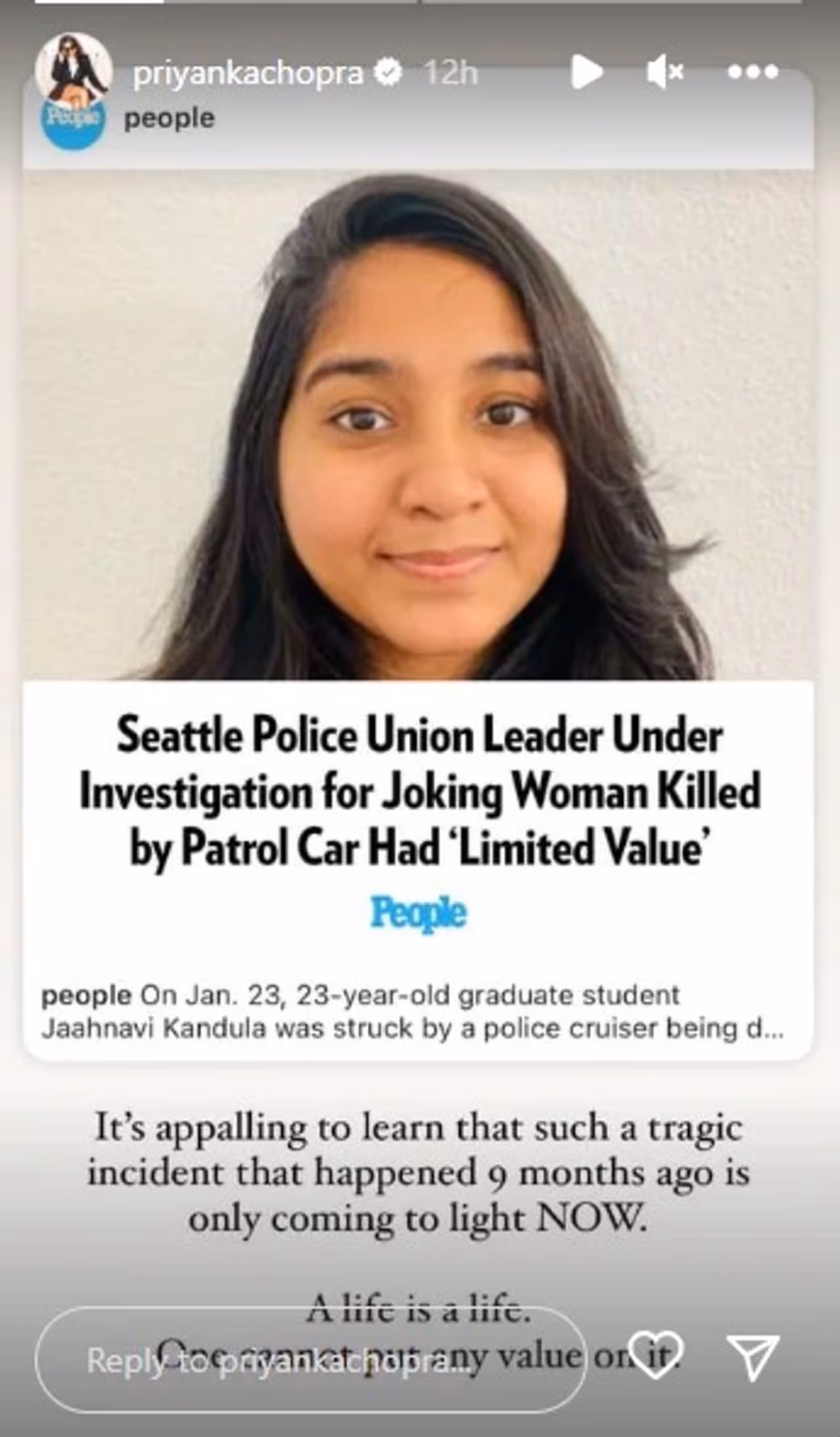 Jaahnavi Kandula, a student in Seattle, US, died after she was hit by a police patrol vehicle. Priyanka Chopra has now reacted to the news with a strong statement.