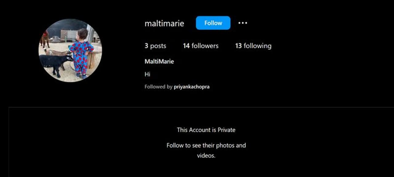 Priyanka Chopra occasionally shares adorable photos of her young daughter, Malti Marie Chopra Jonas, with her fans. The actress, along with her husband Nick Jonas, welcomed Malti through surrogacy in 2022. It wasn't until this past summer that Priyanka unveiled her daughter's face to the public. Interestingly, it has now come to light that there is a secret Instagram account dedicated to Malti. This account, named Malti Marie, was created in March 2022, and it is currently set to private. It follows only 13 people and has 14 followers, including both Priyanka and Nick. The account has posted three photos so far, and its profile picture features a young Malti alongside a goat.