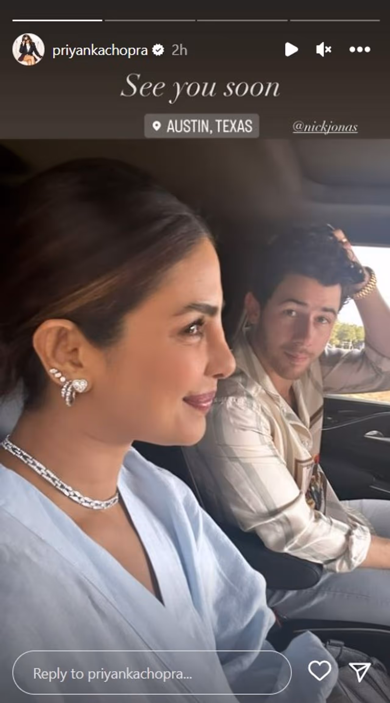 She complimented her attire with diamond earrings and a stunning necklace. She wore mauve lipstick and kept her makeup simple. "Ice ice baby," Priyanka wrote. She then posted another selfie, this one with Nick Jonas. The pair is seen posing in a vehicle, and PeeCee is seen beaming. "See you soon, Austin, Texas," she wrote with the photo.