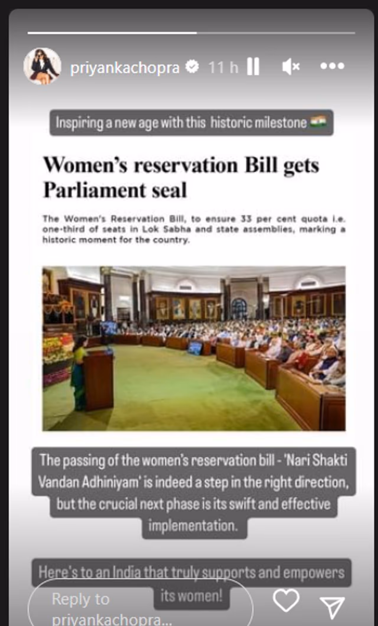 Priyanka Chopra praised the newly passed Women Reservation Bill in the Parliament on her social media accounts, calling it "a step in the right direction."