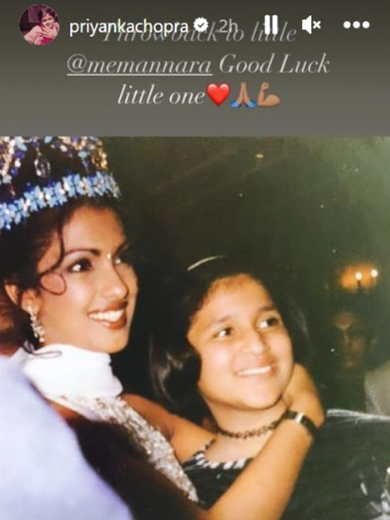 On a Friday morning, Priyanka Chopra took to her Instagram stories to share a remarkable throwback picture from her Miss World 2000 pageant. The photo features a young Mannara Chopra posing alongside Priyanka, with both cousins wearing broad smiles. In the picture, Priyanka is adorned with a crown on her head and dressed in a white outfit, while Mannara dons a black dress.