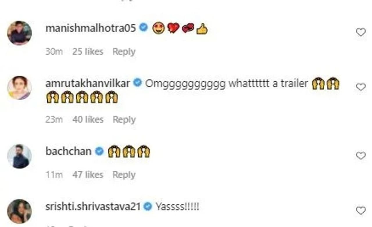 While Abhishek Bachchan ‘hailed’ the trailer with both the hands raised emoticons, fashion designer Manish Malhotra and actress Amruta Khanvilkar also quickly posted emoticons in the comments section, appreciating the actor.