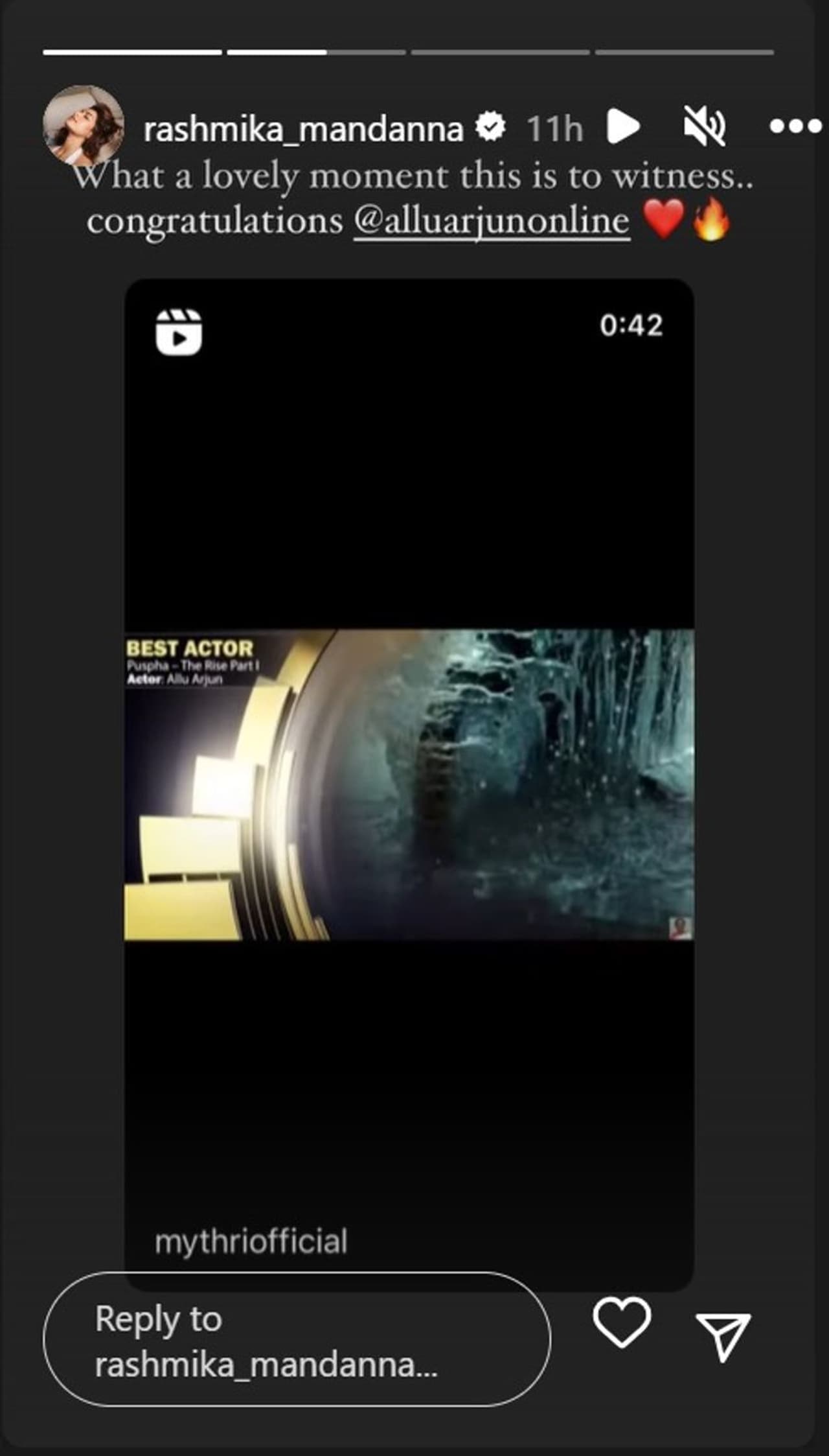 She shared a video on her Instagram story where Allu Arjun's name is being announced and some scene from the film is being played. Sharing this she wrote, "What a lovely moment this is to witness.. congratulations @alluarjunonline (sic)."