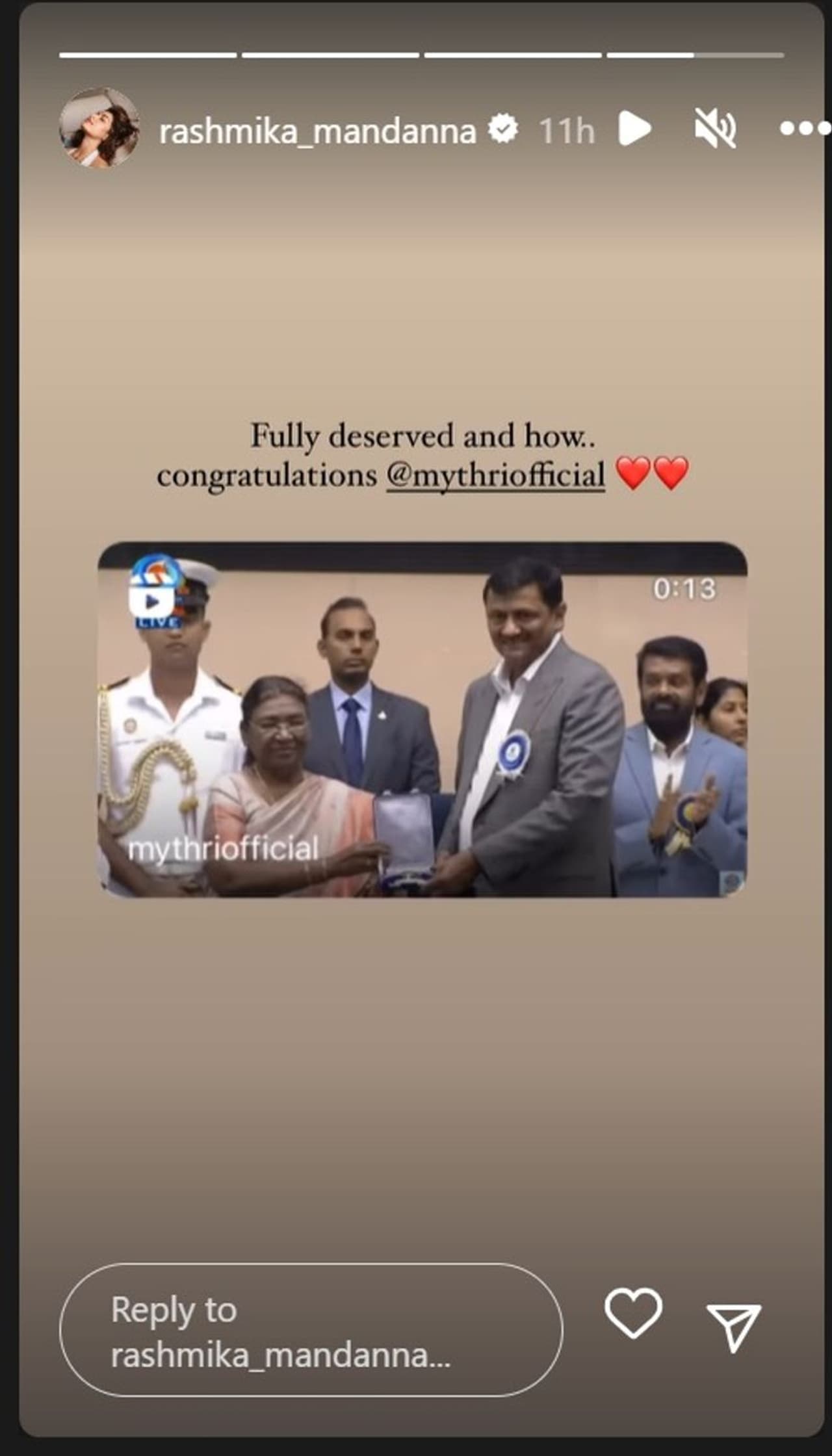 The 69th National Film Awards took place on Tuesday at the Vigyan Bhawan in New Delhi. Many actors, producers, and directors across India were present at the event. South star Allu Arjun was awarded Best Actor for his role in the film 'Pushpa- The Rise I'. While it was a great moment for him, the film's actress and his co-star Rashmika Mandanna took to her Instagram story to applaud the actor. She also posted more Instagram stories where she congratulated others who won awards for 'Pushpa- The Rise I'.