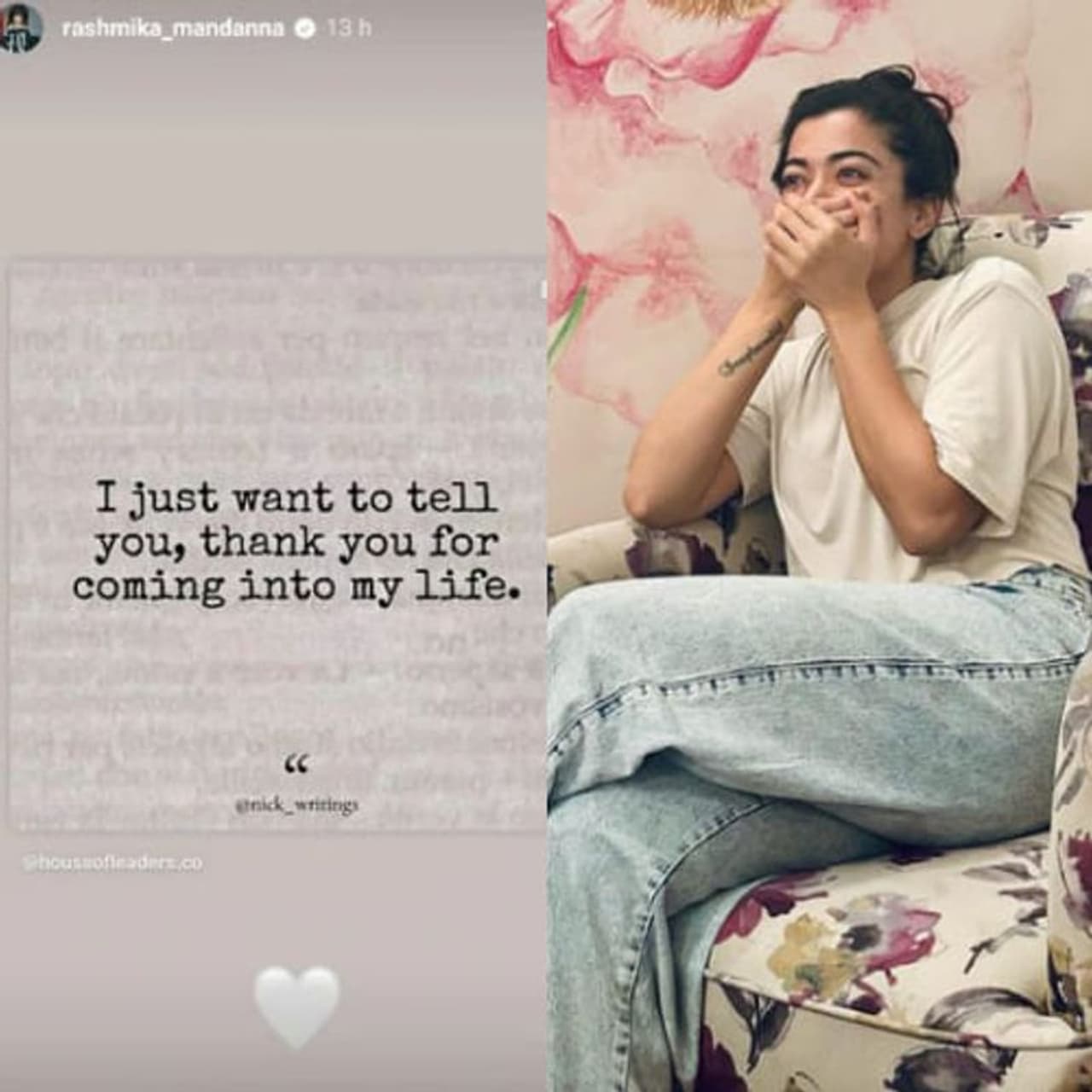 Rashmika Mandanna, recently stirred the internet with a mysterious message, leaving followers speculating about its intended recipient. The actress shared a poignant quote, "I just want to tell you, thank you for coming into my life," accompanied by a white-heart emoji. Despite the absence of tags or overt clues, social media erupted with theories, many surmising that the message was directed at her rumored partner, Vijay Deverakonda.