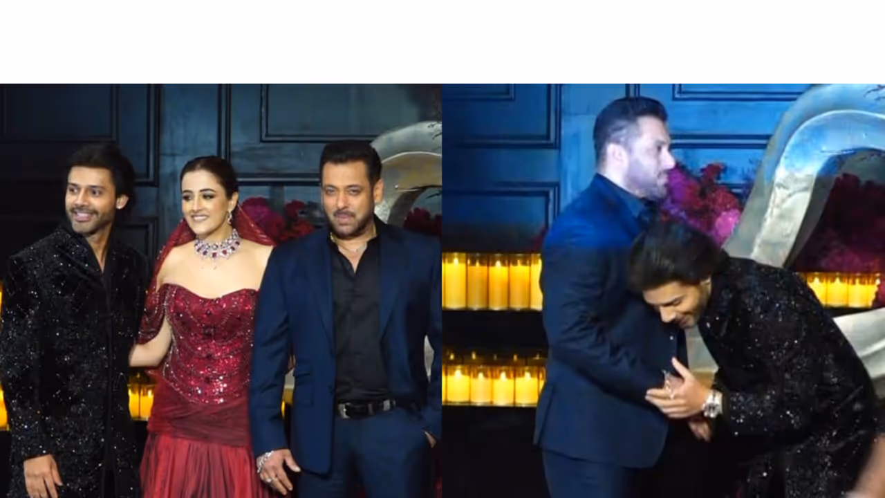 Salman arrived at the venue in style and made sure all eyes were on him. As he entered, the newlyweds warmly welcomed him. Stebin Ben was seen greeting Salman and bowing to him in respect. Salman greeted the couple and posed with them for photos, smiling for the cameras. The 'Bodyguard' actor looked dapper in a blue suit. He spent some time with the couple and was seen chatting and posing with them on the red carpet.