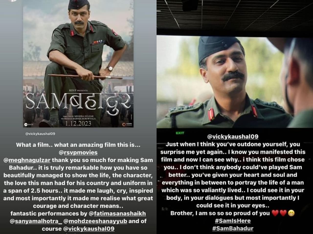 In the next Story, he praised his brother's performance in the film and wrote, ''Just when I think you’ve outdone yourself, you surprise me yet again. I know you manifested this film, and now I can see why. I think this film chose you. I don’t think anybody could’ve played Sam better. You’ve given your heart and soul and everything in between to portray the life of a man who was so valiantly lived. I could see it in your body, in your dialogues but most importantly I could see it in your eyes.''