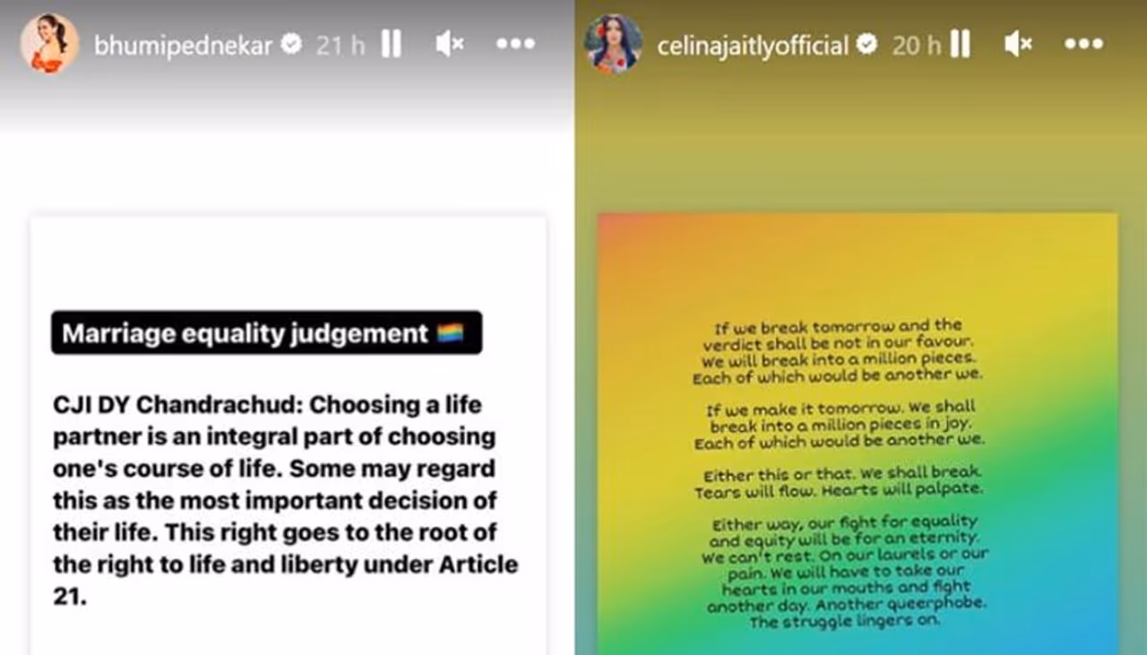 Supreme Court refused to legalize same-sex marriage, leaving it to the Parliament. Actress Celina Jaitly expressed disappointment, while Bhumi Pednekar also opposed the decision. The five-judge bench had varying opinions, with two judges supporting recognition of same-sex unions and adoption rights. This followed petitions challenging marriage laws by LGBTQ+ activists