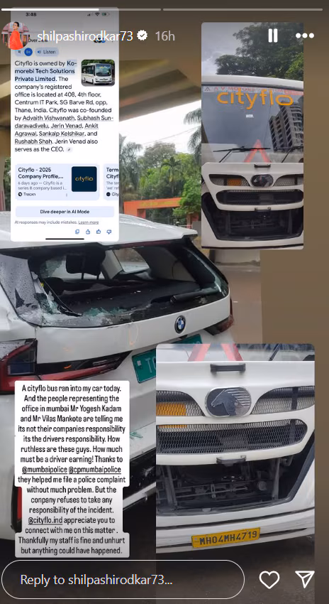 Shilpa also thanked the Mumbai Police for their swift and helpful response. She mentioned that they assisted her in filing an official complaint without any difficulty. Tagging Cityflo's official handle, she noted that while the company eventually reached out, they still refused to acknowledge any accountability for the accident.