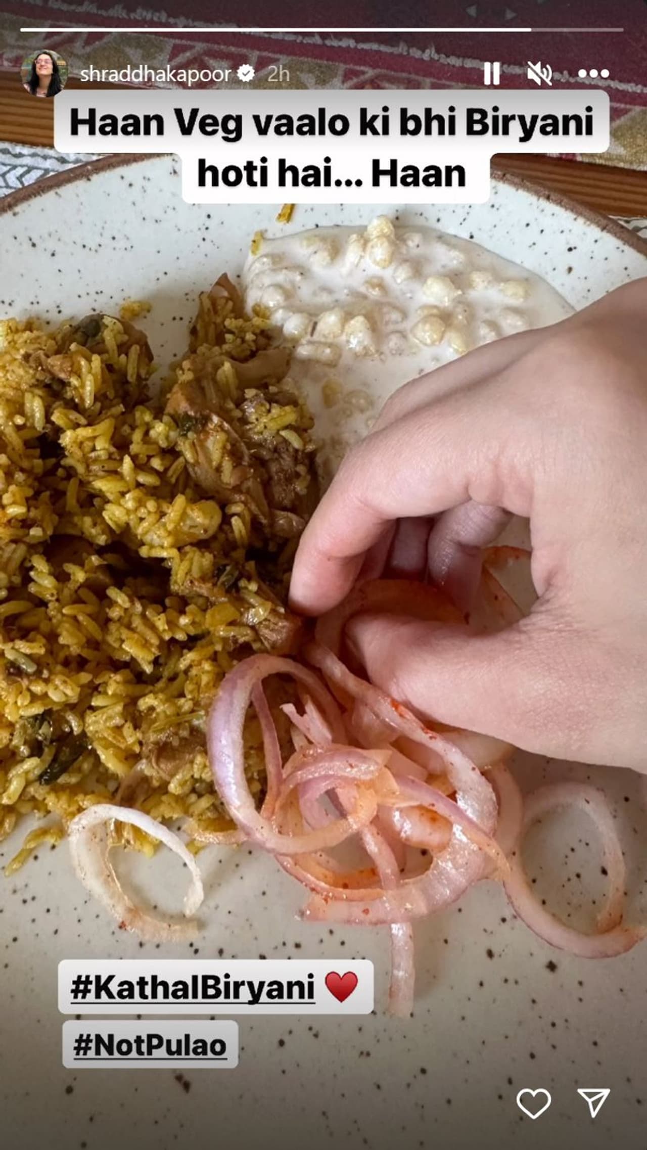 Bollywood's food-loving Shraddha Kapoor shares her 'Kathal' biryani joy on instagram, adding humor to the 'Veg Biryani' vs. 'Pulao' debate!