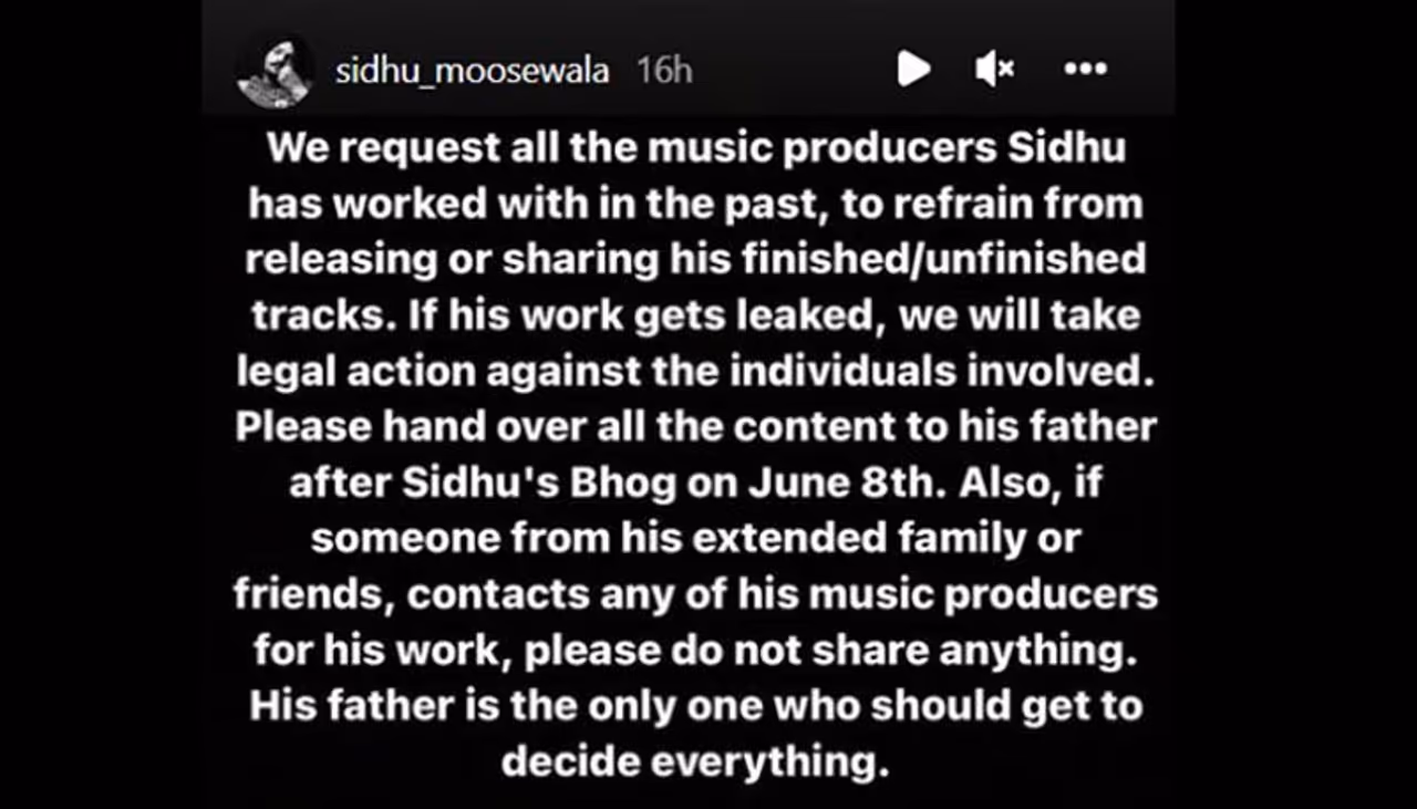Taking to Instagram through Sidhu Moose Wala’s Instagram handle, a post was shared that read: “We request all the music producers Sidhu has worked with in the past, to refrain from releasing or sharing his finished/unfinished tracks. If his work gets leaked, we will take legal action against the individuals involved. Please handover all the content to his father after Sidhu’s Bhog on June 8th.”
