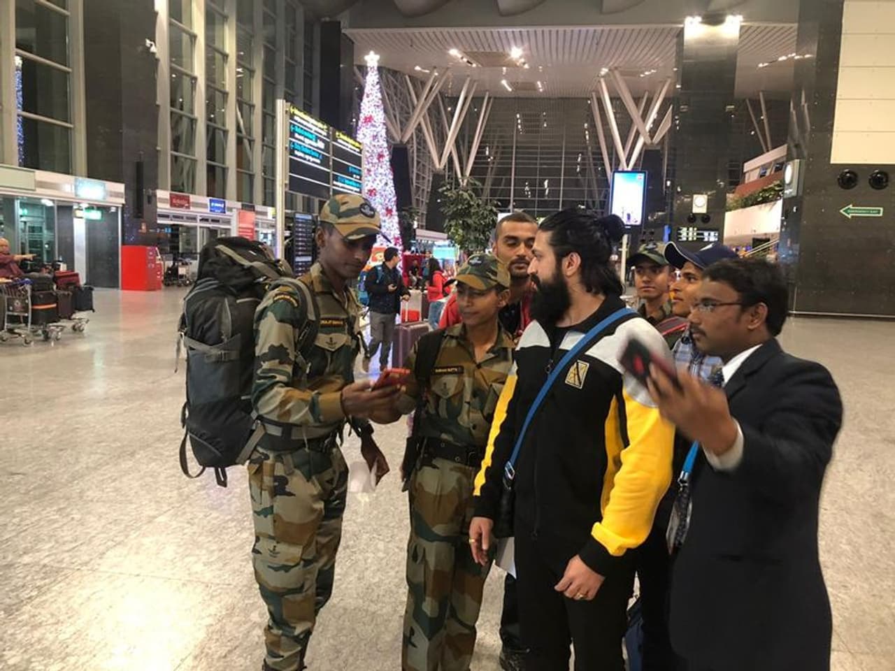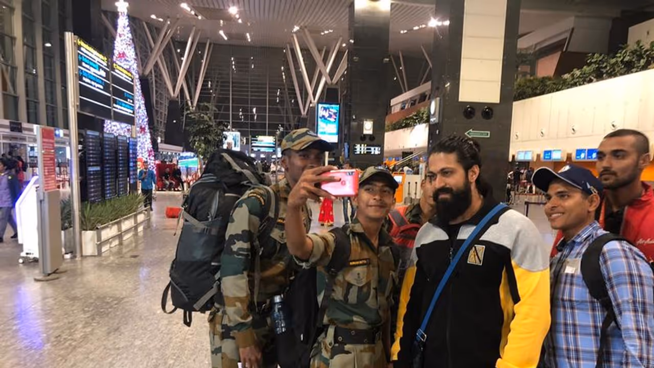 Upon returning from a shooting schedule, Yash bumped into some fans at the Kempegowda International Airport in Bengaluru. Well, they were not some ordinary fans but soldiers who requested a selfie with the Rocking star. The soldiers were returning to their camps when they sighted Yash at the airport.