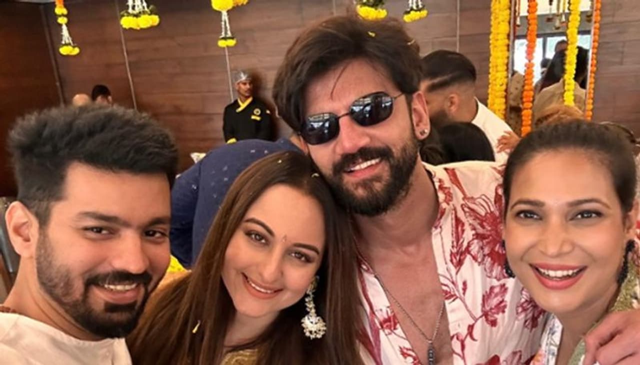 Sonakshi Sinha and her longtime boyfriend, Zaheer Iqbal, are set to get married on June 23. Their pre-wedding festivities have already started, with an intimate Mehendi ceremony recently taking place, attended by family and close friends. A new photo from the ceremony shows Sonakshi and Zaheer smiling as they pose for a selfie with friends. Sonakshi looks stunning in red ethnic attire, while Zaheer sports a stylish floral print kurta with a low neckline.