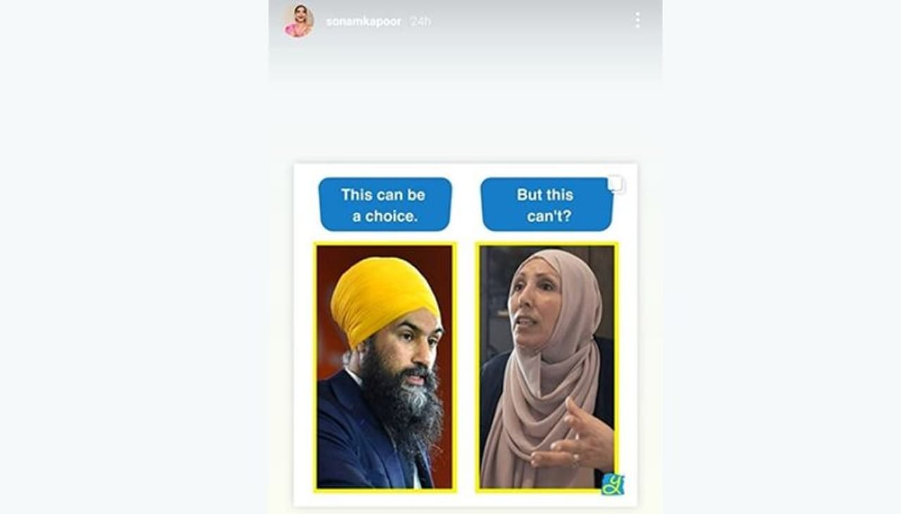Sonam Kapoor shared a post on her Instagram story which had two images – a Sikh man in a turban on the left and a Muslim woman in a hijab on the right. The post questions – if turban can be a choice, then why can’t hijab?