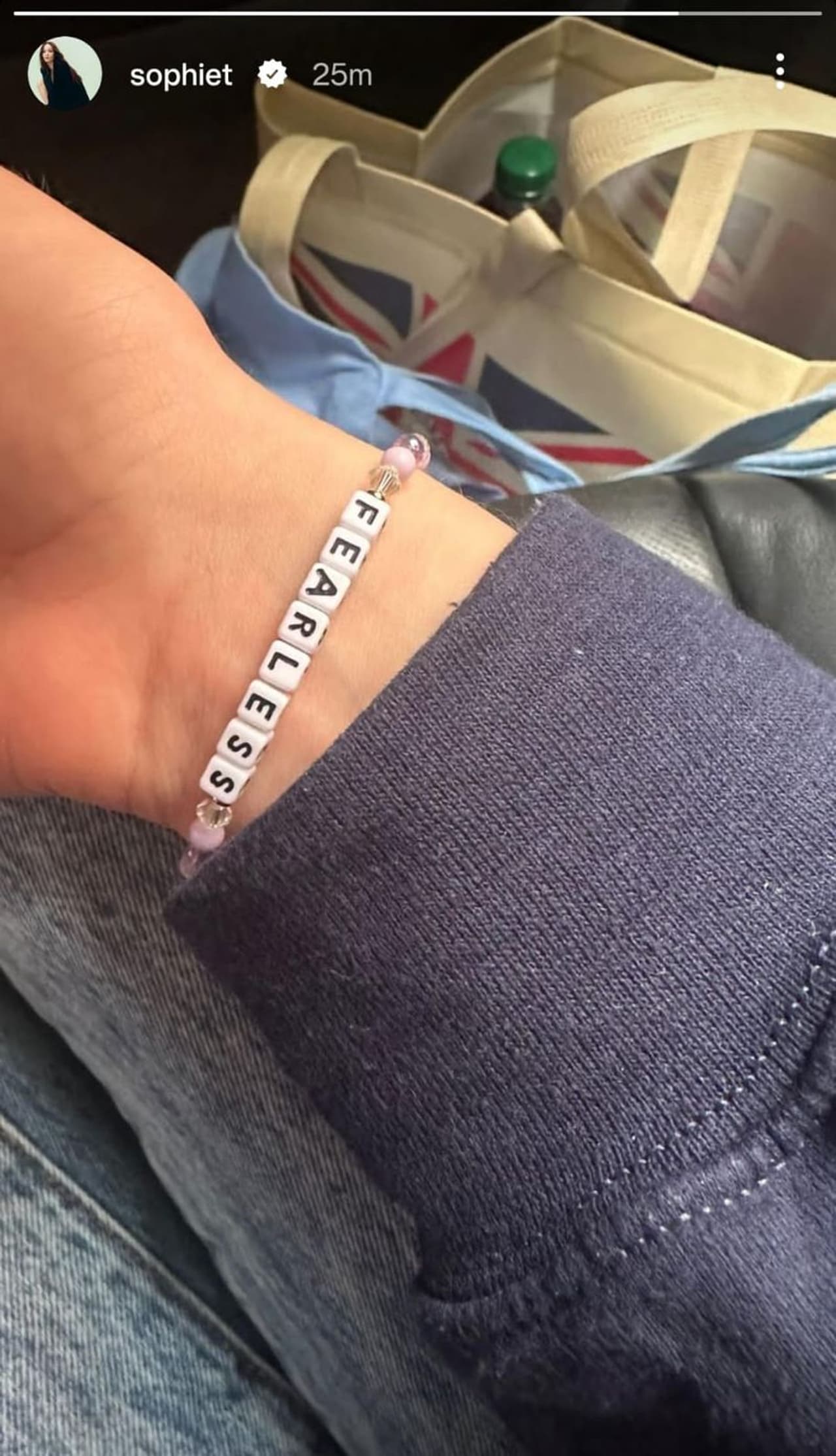 Sophie was wearing a bracelet with the word "fearless" on it in the shot. The bracelet looked to be a tribute to her pal Taylor Swift, who has a Fearless album. Sophie removed the message a few hours later. See her deleted photo below: