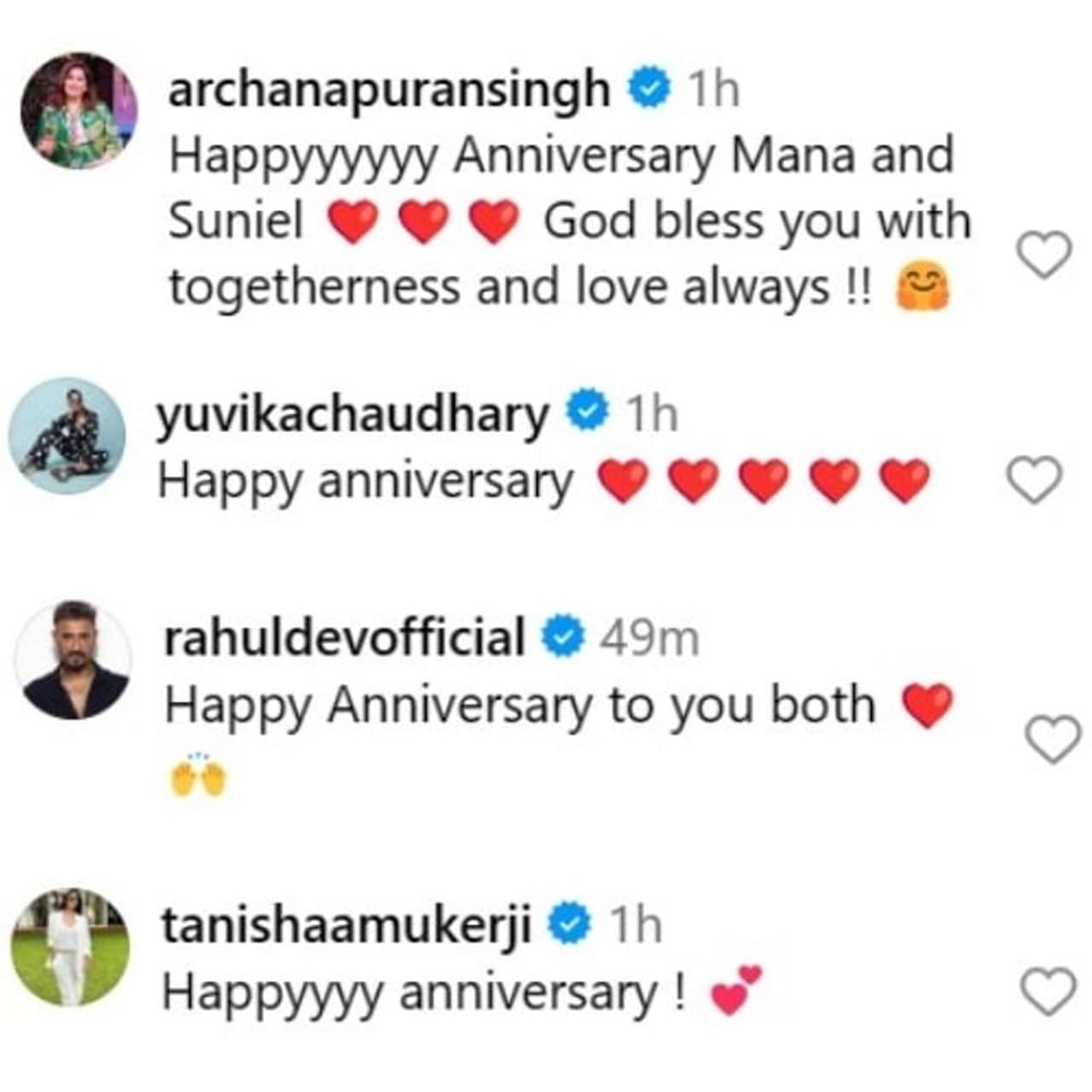 Following Suniel Shetty's post, several celebrities congratulated the couple in the comments section. Archana Puran Singh extended her wishes, writing, “Happyyyyyy Anniversary Mana and Suniel. God bless you with togetherness and love always!!” Tanishaa Mukerji and Rahul Dev also wished the couple a happy anniversary, with Yuvika Chaudhary expressing her greetings as well.