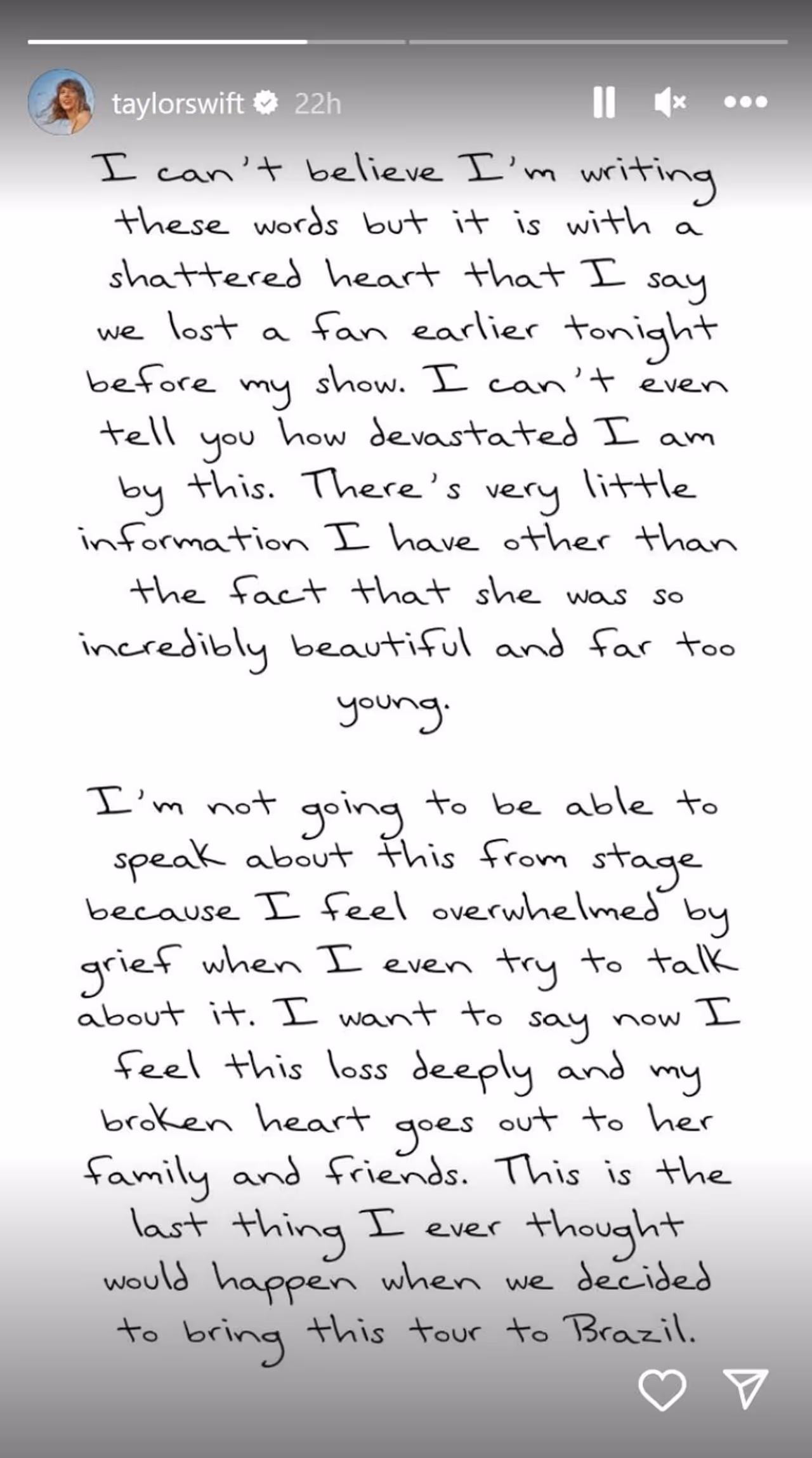 The upsetting news came just before the concert began – a fan named Ana Clara Benevides, who was 23 years old, fell ill at the venue and sadly passed away due to cardiorespiratory arrest. Taylor Swift, visibly saddened by this heartbreaking incident, shared her feelings on Instagram Stories, expressing grief over the untimely loss of Ana Clara.