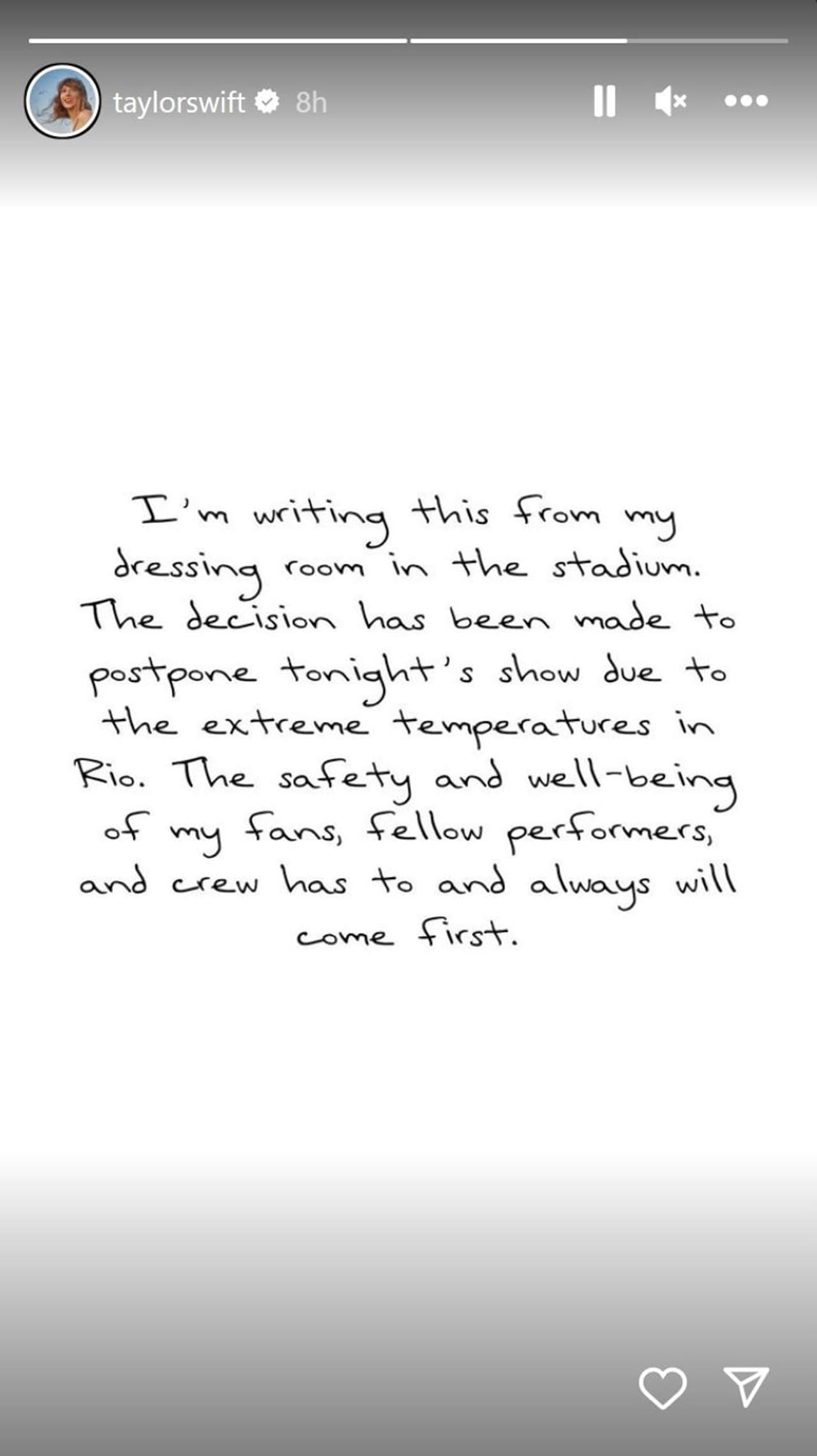 In addition to this, Taylor swift has now postponed her next show which was supposed to take place in Rio de Janerio. In another story on instagram she penned “I’m writing this from my dressing room in the stadium. The decision has been made to postpone tonight’s show due to the extreme temperatures in Rio. The safety and well being of my fans, fellow performers, and crew has to and always will come first,”