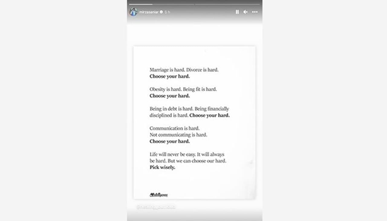 On Instagram, Sania shared a post emphasising the challenges of marriage and divorce, urging people to choose their battles wisely. The post addressed the complexities of various life choices, fuelling further speculation about the state of Sania Mirza and Shoaib Malik's marriage.