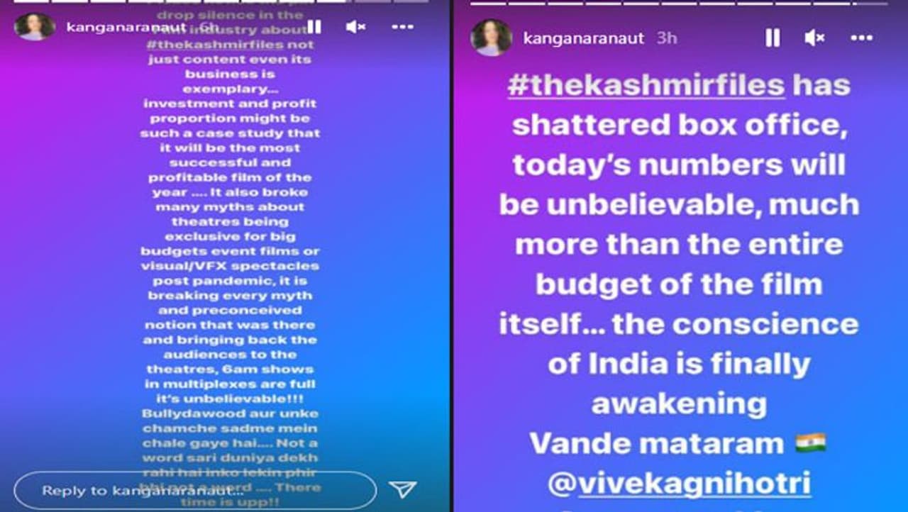 On Sunday, March 13, Kangana shared a long note about the film on her Instagram Stories, where she wrote, "Please notice the pin drop silence in the film industry about #thekashmirfiles not just content even its business is exemplary... investment and profit proportion might be such a case study that it will be the most successful and profitable film of the year. It also broke many myths about theatres being exclusive for big budgets event films or visual/VFX spectacles post pandemic, it is breaking every myth and preconceived notion that was there and bringing back the audiences to the theatres, 6am shows in multiplexes are full it's unbelievable!!!"