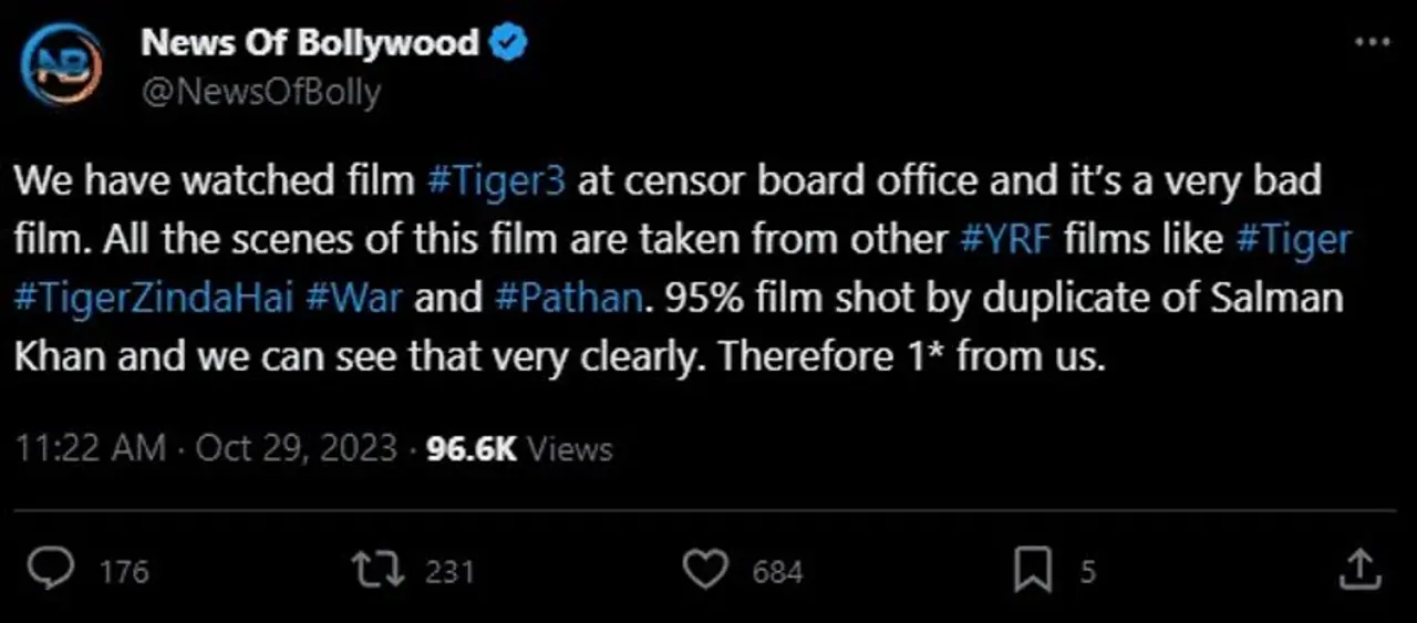 The tweet claims that the majority of the film was shot with a Salman Khan lookalike and implied that parts of the film are lifted from previous Yash Raj Films (YRF) projects, including "Tiger," "Tiger Zinda Hai," "War," and "Pathaan." It ends with a rating of just one star.