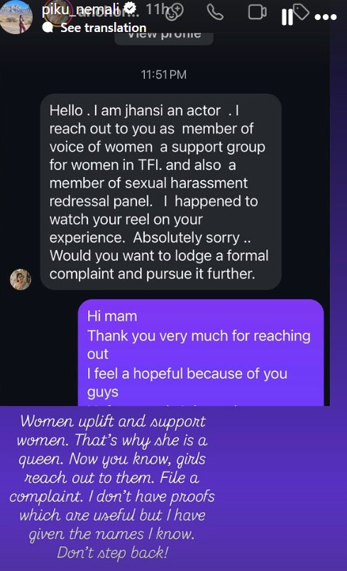Following the viral video, popular television artist Jhansi reached out to the influencer. Jhansi, who is part of the women's support panel in the industry, advised her to file a formal complaint with the Sexual Harassment Redressal Panel for further action.