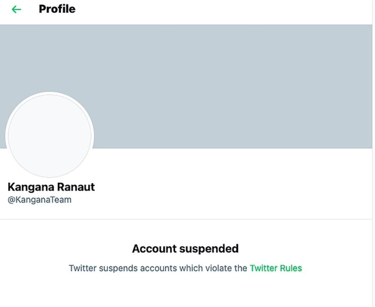 Twitter has suspended actor Kangana Ranaut's account for violation of its rules.