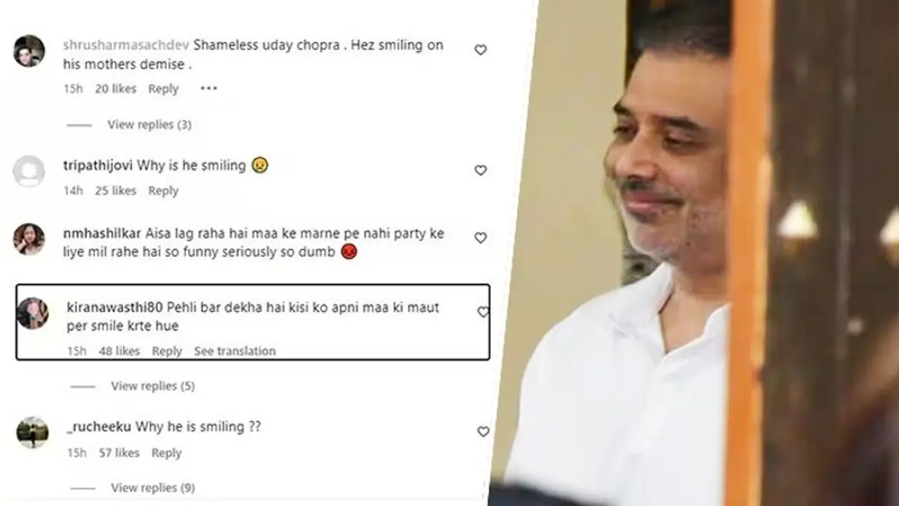 Netizens noticed Uday Chopra beaming as he greeted Aamir Khan and Kiran Rao, who paid them a visit in the evening. People mocked him, asking how he could be happy after his mother died just hours before.