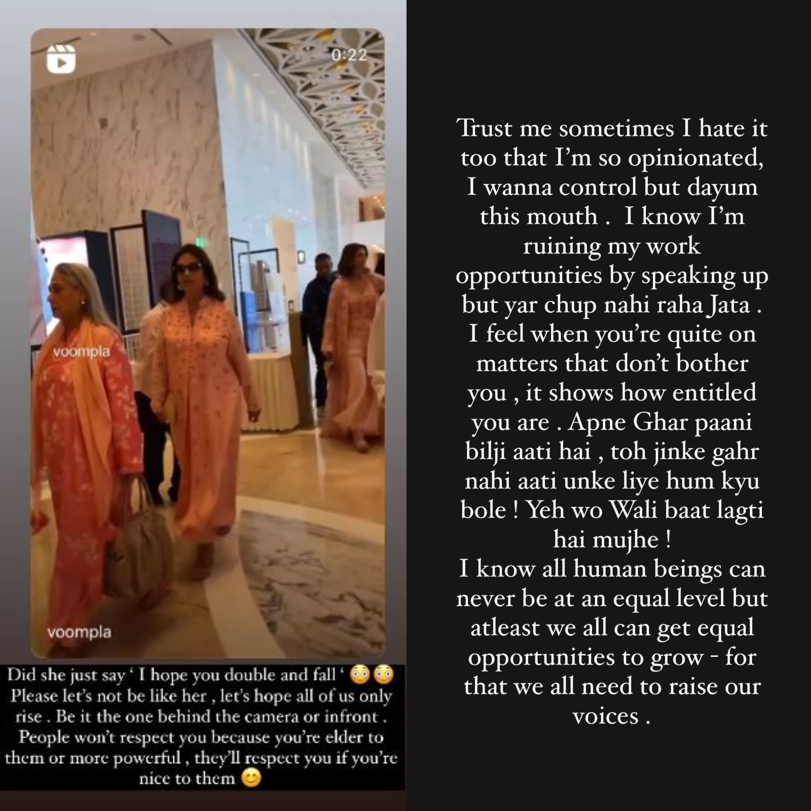 “Did she just say ‘I hope you double and fall’. Please let’s not be like her, let’s hope all of us only rise. Be it the one behind the camera or in front. People won’t respect you because you’re elder to them or more powerful, they’ll respect you if you’re nice to them," she wrote.
