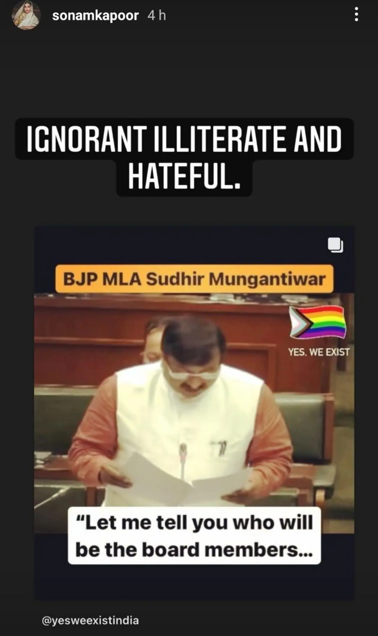 Mungantiwar said, "Are you going to hire lesbians and gays as members? Shouldn’t a joint medical committee be set up on this? It mentions bisexual and asexual relations. However, no one has yet defined these." Expressing her views and concern over the matter, Sonam Kapoor took to her Instagram story, posted Sudhir Mungantiwar's image, and wrote, "Ignorant, illiterate and hurtful."