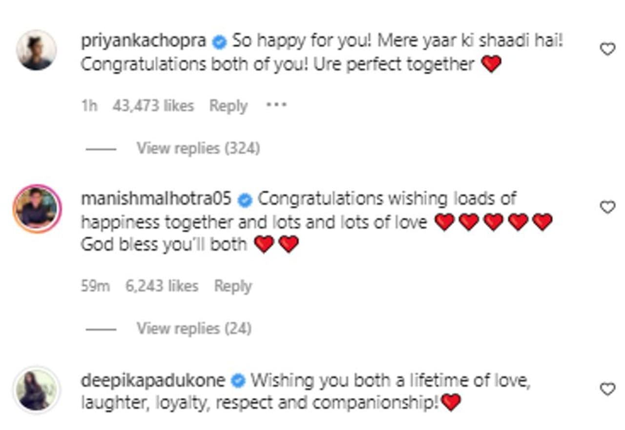 Alia Bhatt took to her Instagram story to write, "Congratulations, you two beautiful souls". Kiara Advani wished the couple a lifetime of love, happiness and togetherness. Varun Dhawan also wished the couple love, positivity as they embarked on this new journey. Kareena Kapoor Khan wrote, "The power of love. Congratulations, you two". Karan Johar also wished congratulations to the couple and said that he wished them both decades of abundant joy and eternal happiness… All love and best energies coming their way. Power couple Nick Jonas and Priyanka Chopra also commented. Nick wrote, "Congrats", whereas Priyanka wrote that she is happy for both of them.