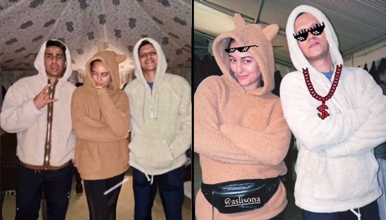 The actor struck a pose with his Fallen co-star Sonakshi Sinha wearing fuzzy jackets and he also added a sheep GIF as a fun element.